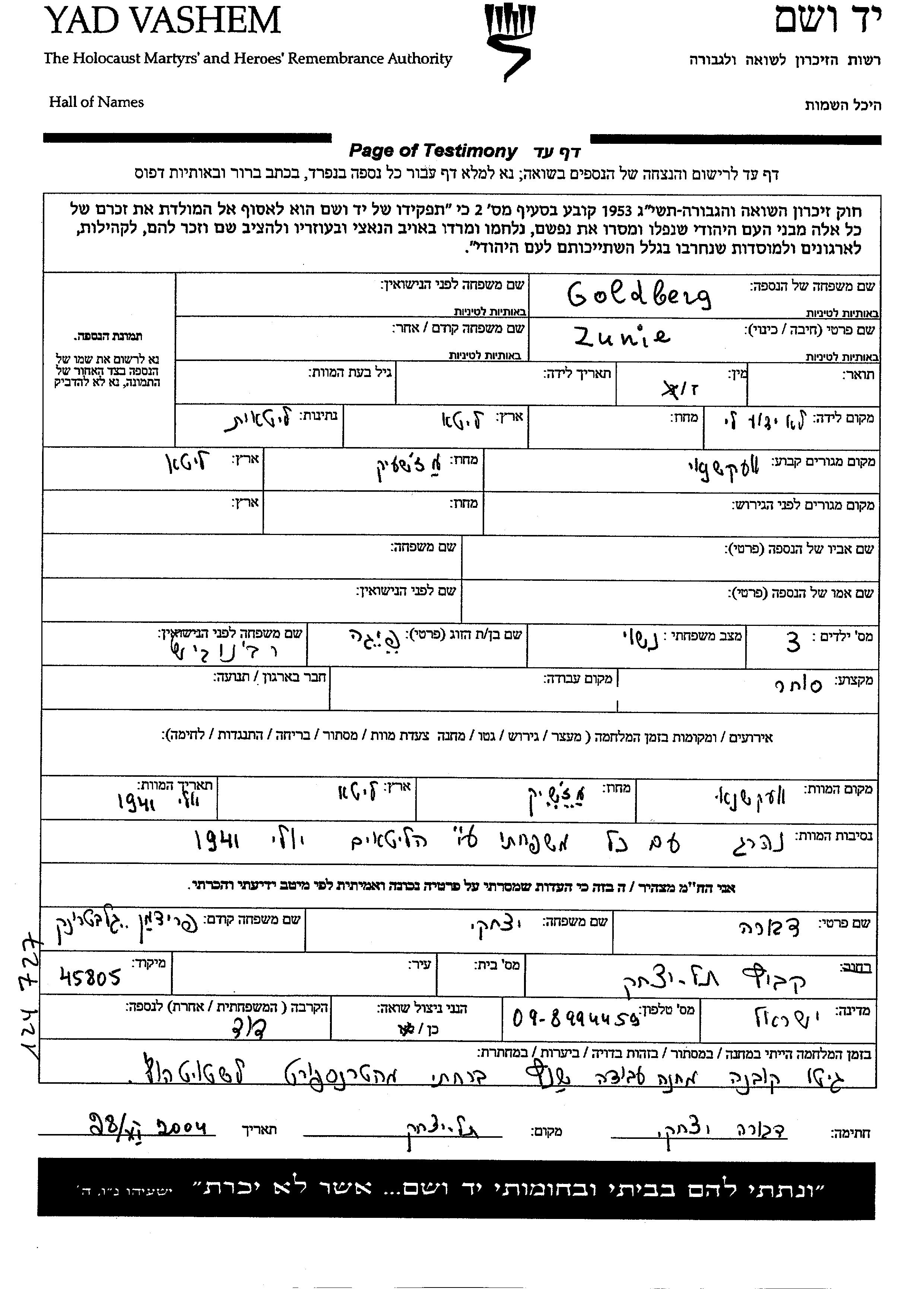 Зуне Гольдберг, место рождения: Литва. Женат / замужем. Место жительства до войны: Векшняй, Литва. Место во время войны: Векшняй, Литва.
