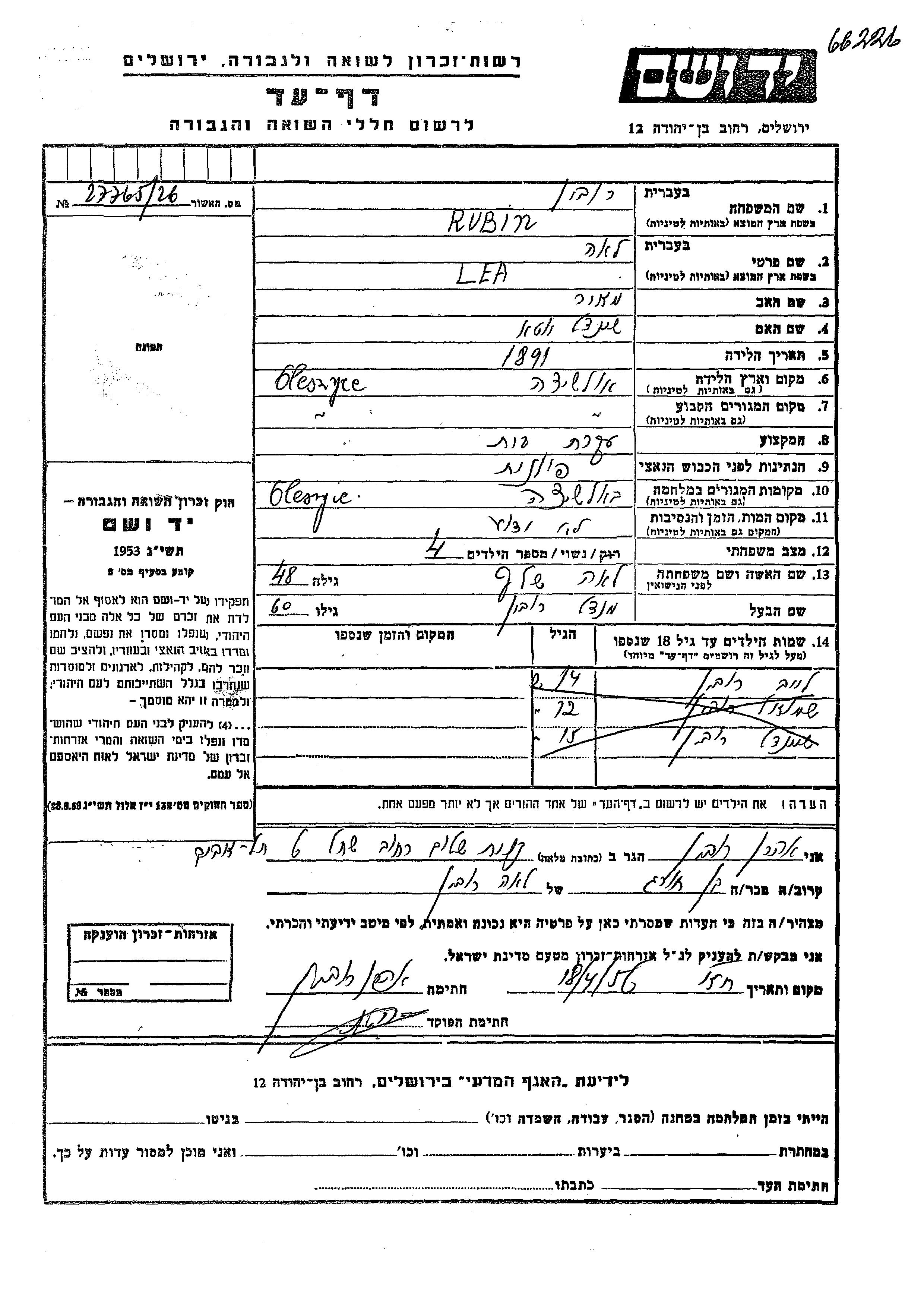 Рубин Лея 1891 Олешице, Польша Лист свидетельских показаний