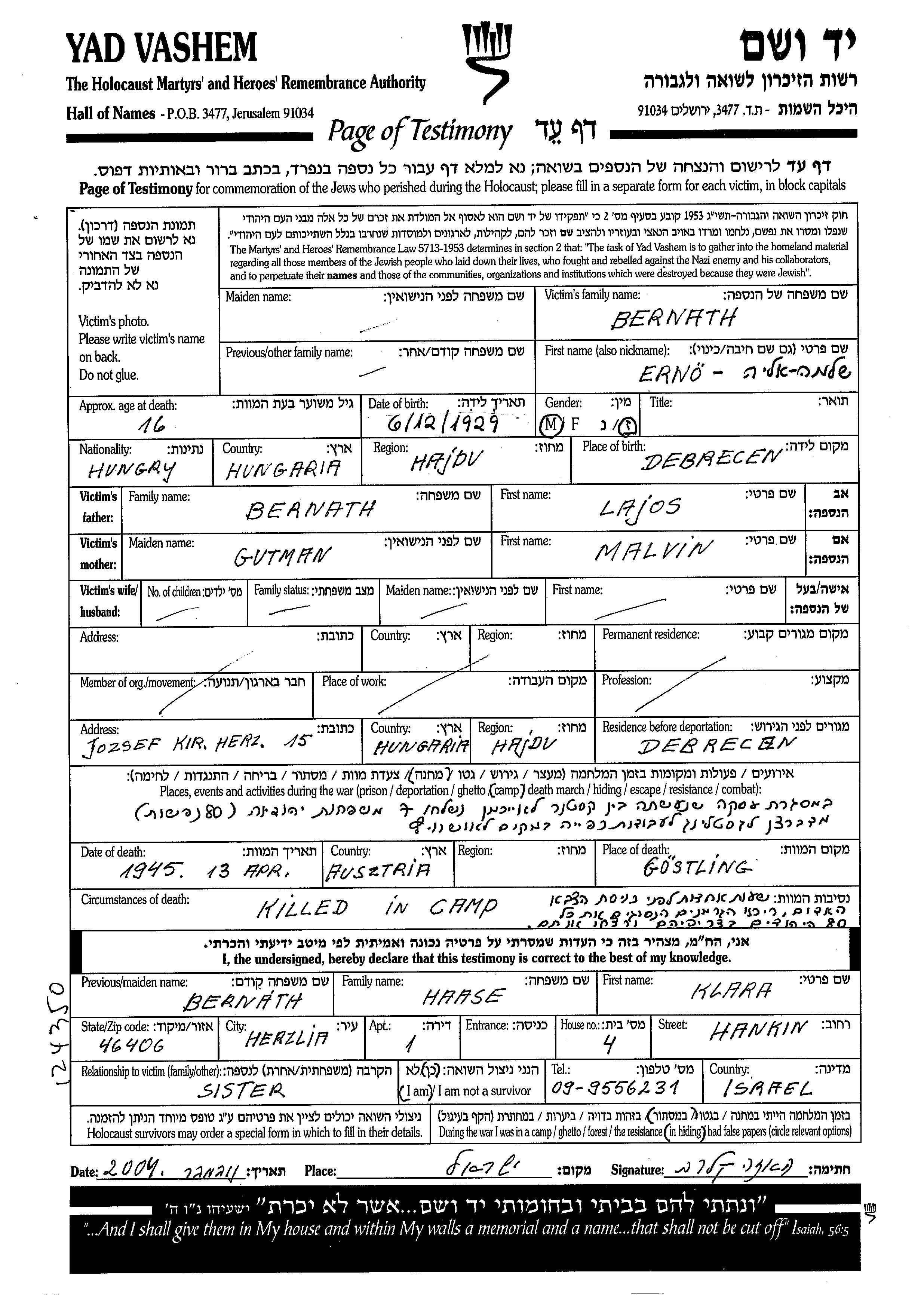 Эрно Шломо Алия Бернат, место рождения: Дебрецен, Венгрия. Отец: Лайош, mать:Мальвин, девичья фамилия Гутман. Место во время войны: ЛАГЕРЬ.