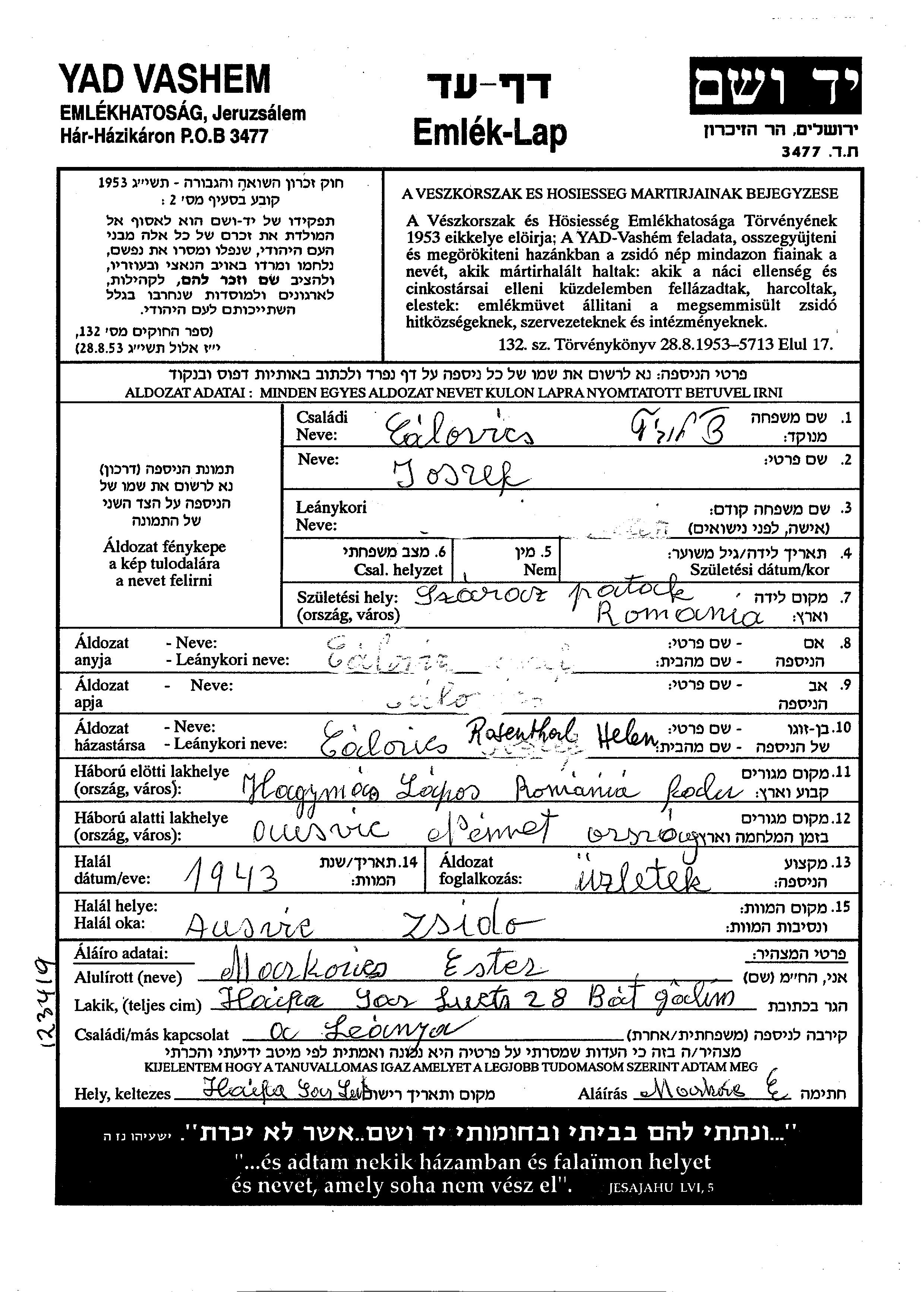 Иосеф Цалович, место рождения: Саразпатак, Румыния. Место жительства до войны: Надьмашлапош, Румыния. Место во время войны: Аушвиц, Польша.