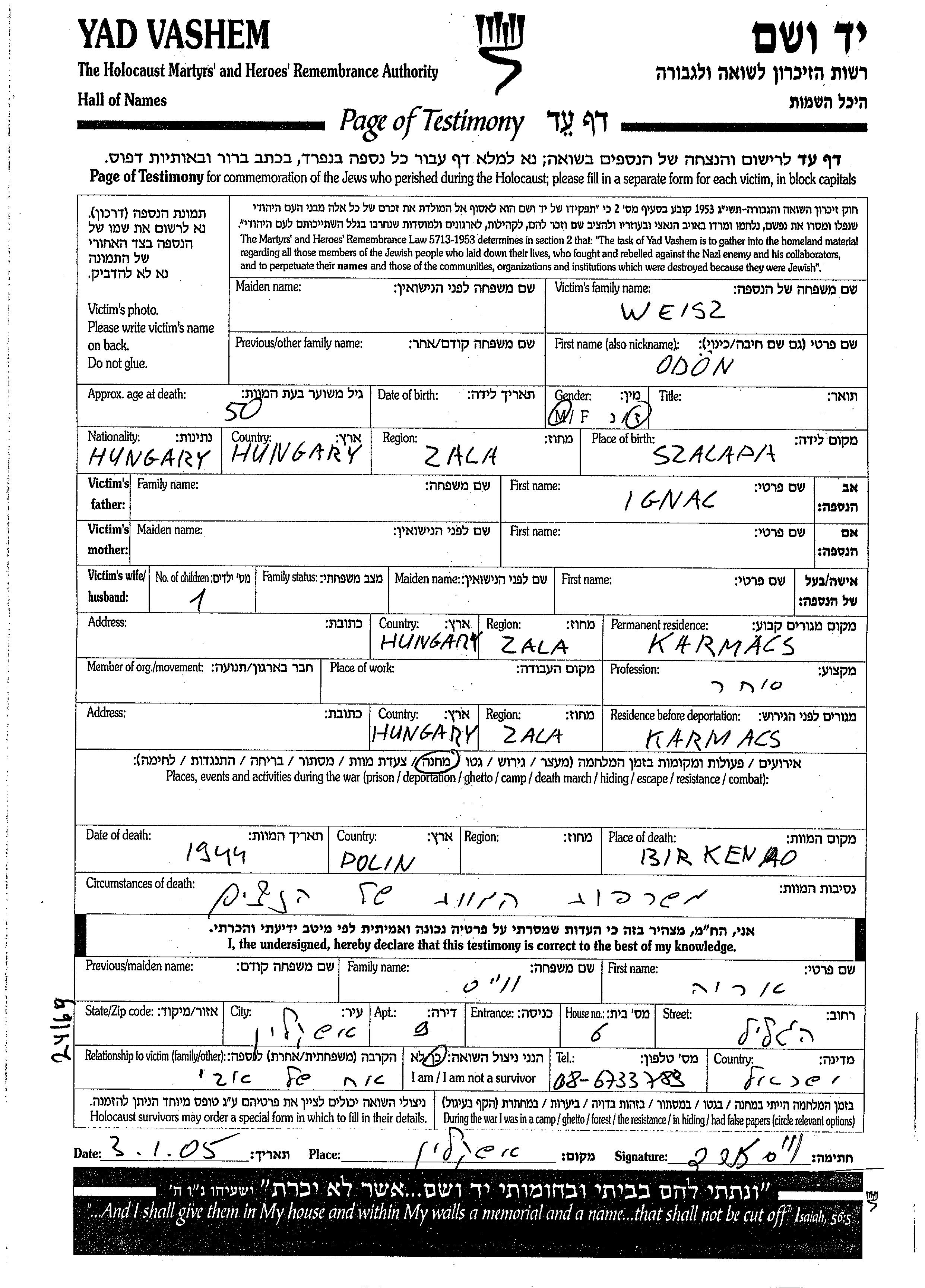 Одон Вейс, место рождения: Салапа, Венгрия. Отец: Игнац. Место жительства до войны: Кармач, Венгрия. Место во время войны: ЛАГЕРЬ.