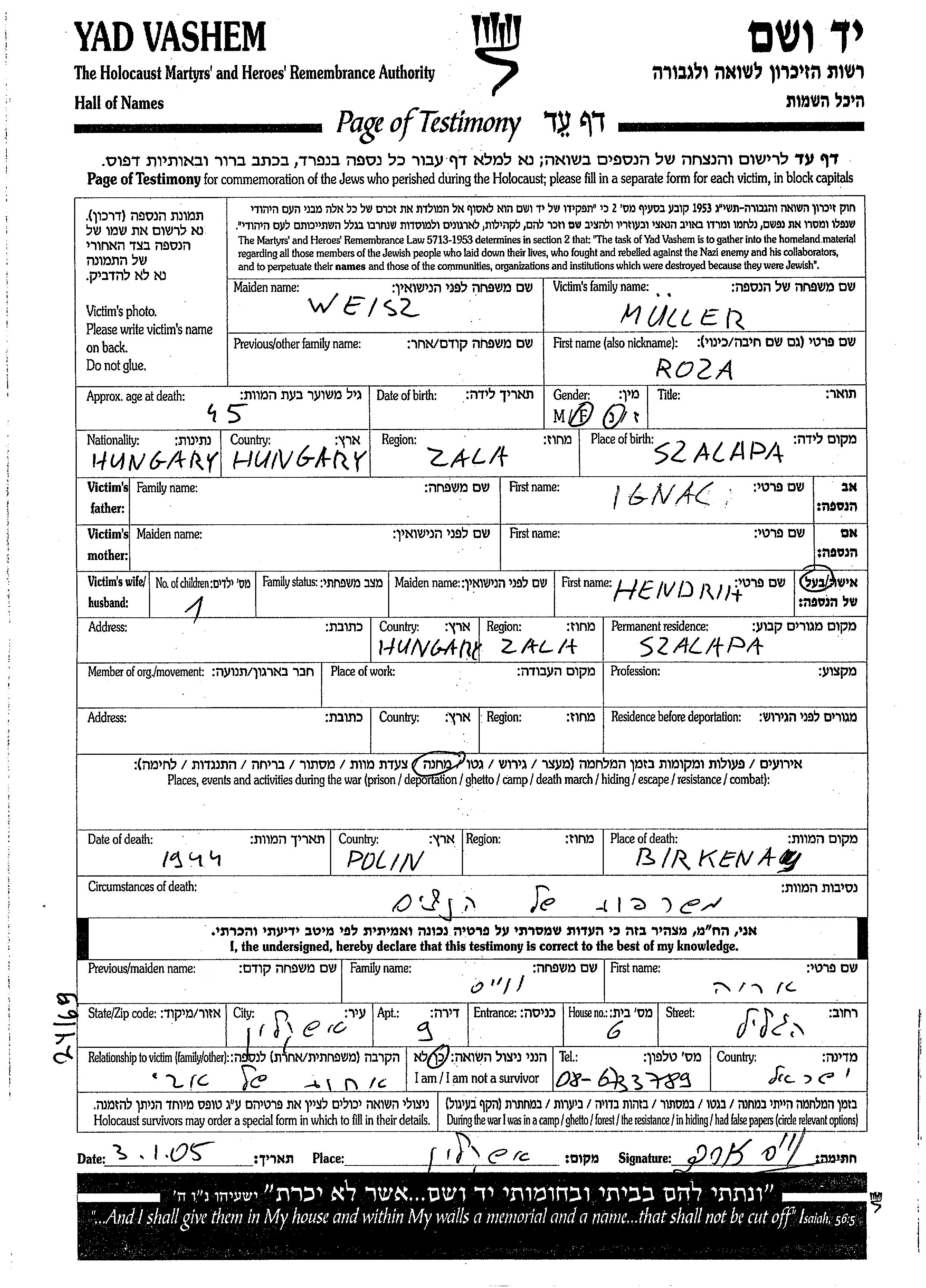 Роза Мюллер, девичья фамилия Вейс, место рождения: Залаапати, Венгрия. Отец: Игнац. Женат / замужем. Место жительства до войны: Залаапати, Венгрия. Место во время войны: Залаапати, Венгрия.