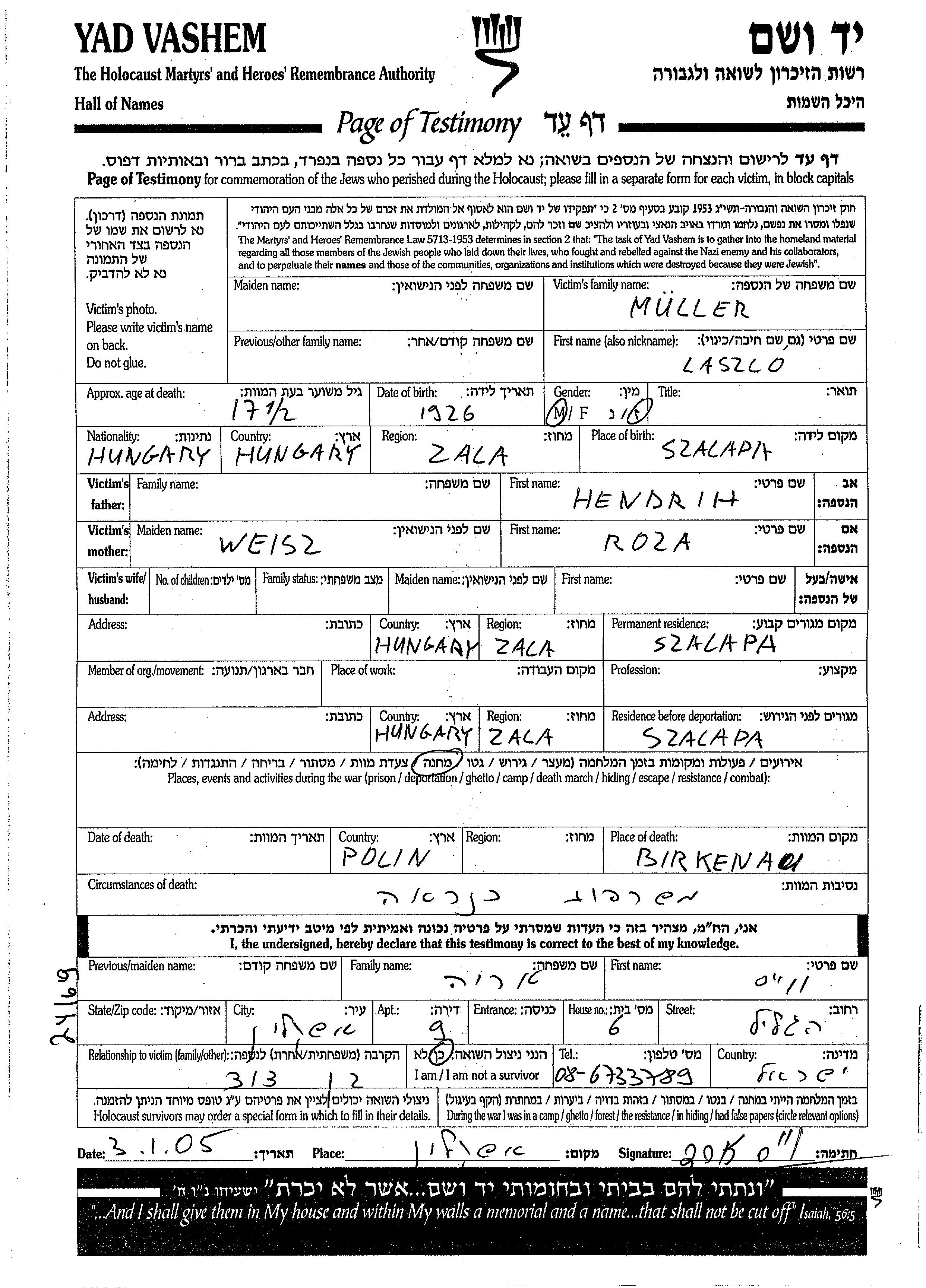 Ласло Мюллер, место рождения: Залаапати, Венгрия. Отец: Хендрих, mать:Роза, девичья фамилия Вейс. Место жительства до войны: Залаапати, Венгрия. Место во время войны: ЛАГЕРЬ.