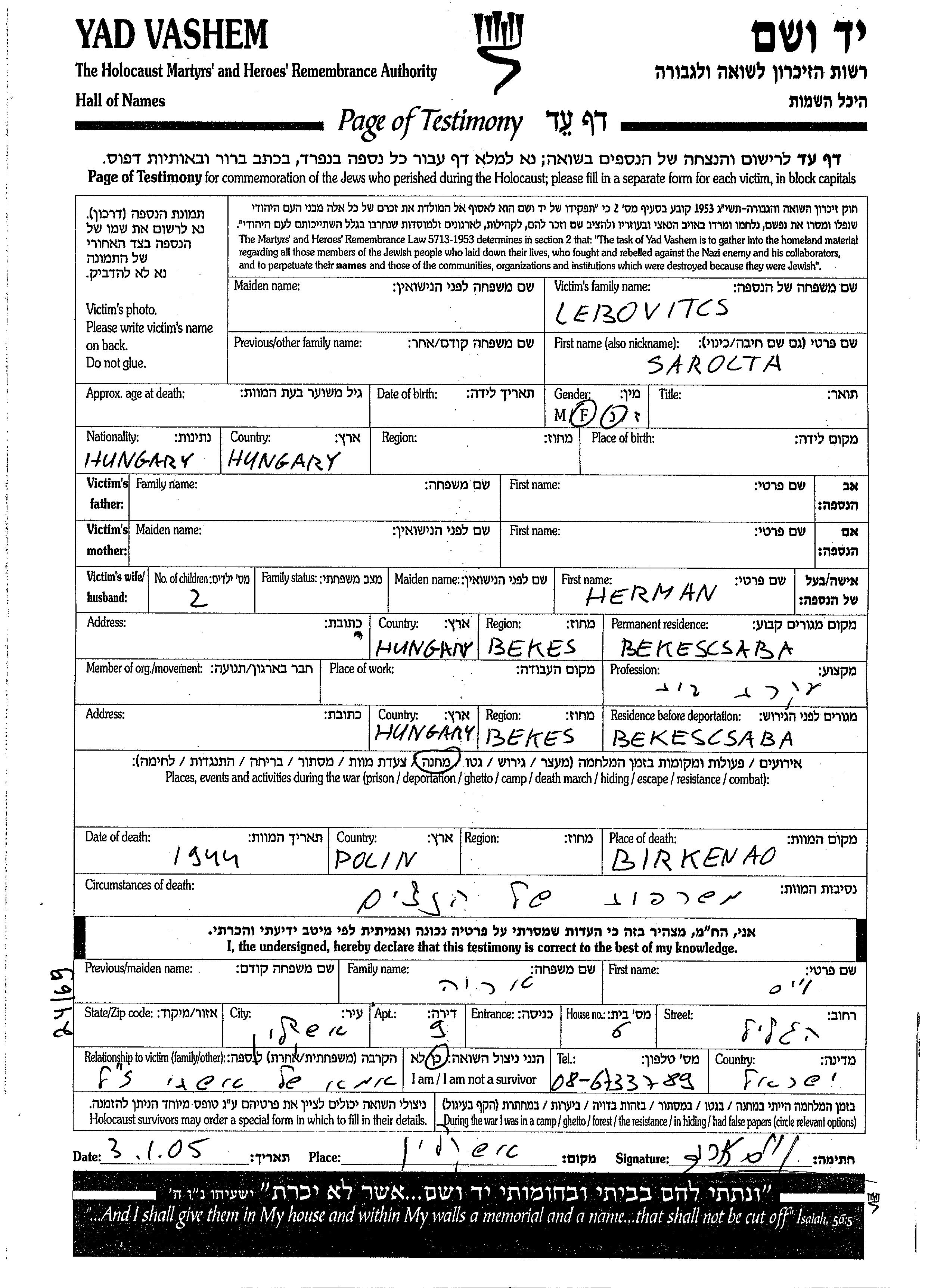 Лебовиц Шарольта Бекешчаба, Венгрия Лист свидетельских показаний