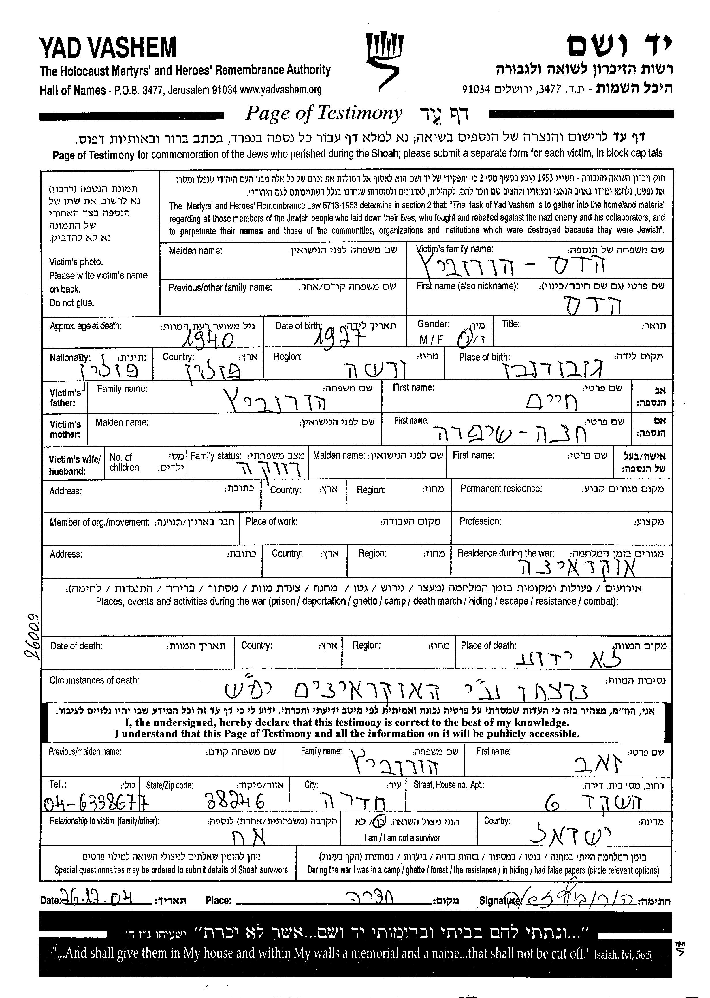 Яд Вашем - Листы свидетельских показаний Мемориального фонда