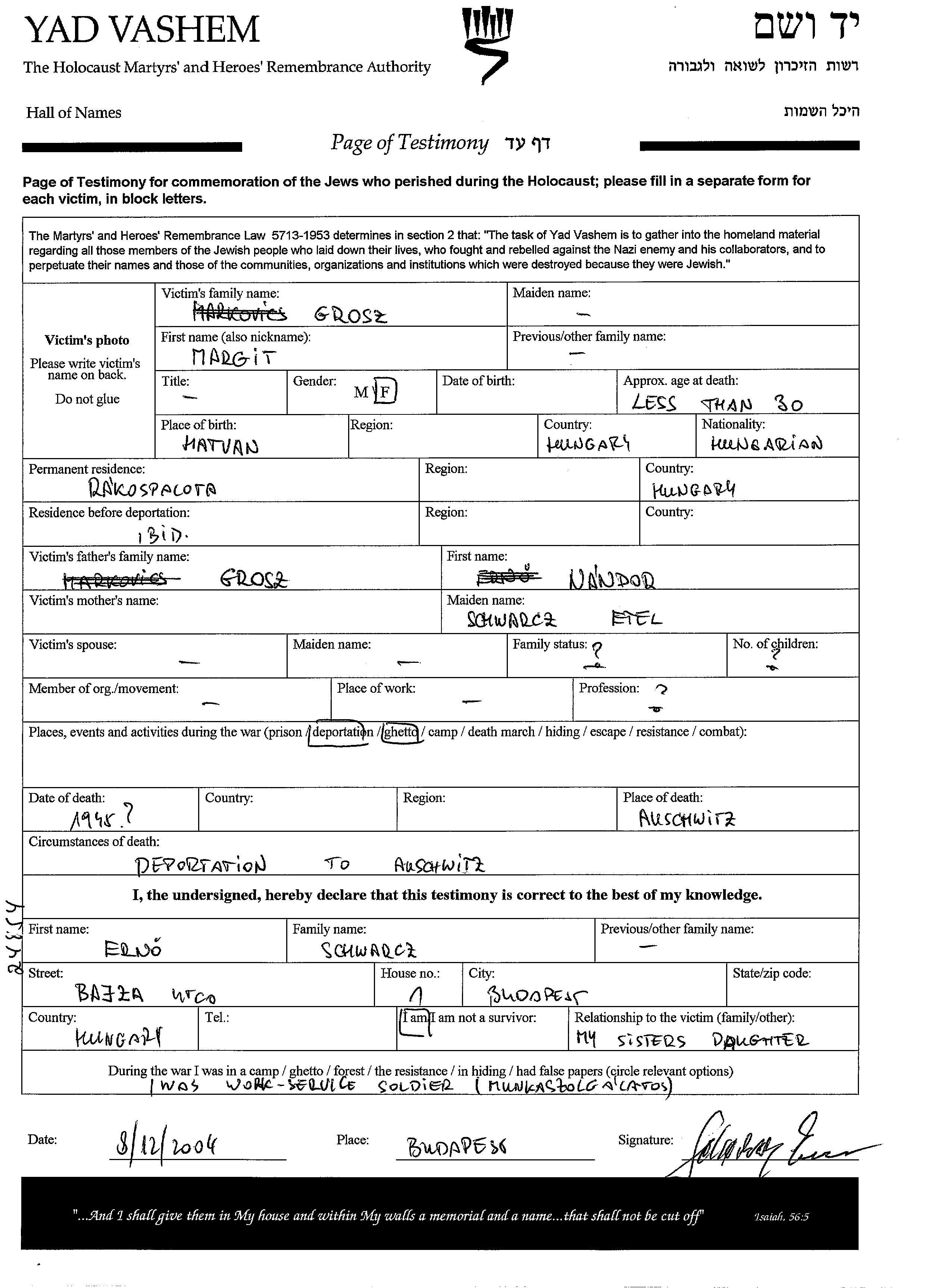 Маргит Грос, место рождения: Хатван, Венгрия. Отец: Нандор, mать:Этель, девичья фамилия Шварц. Место жительства до войны: Ракошпалота, Венгрия. Место во время войны: Ракошпалота, Венгрия.