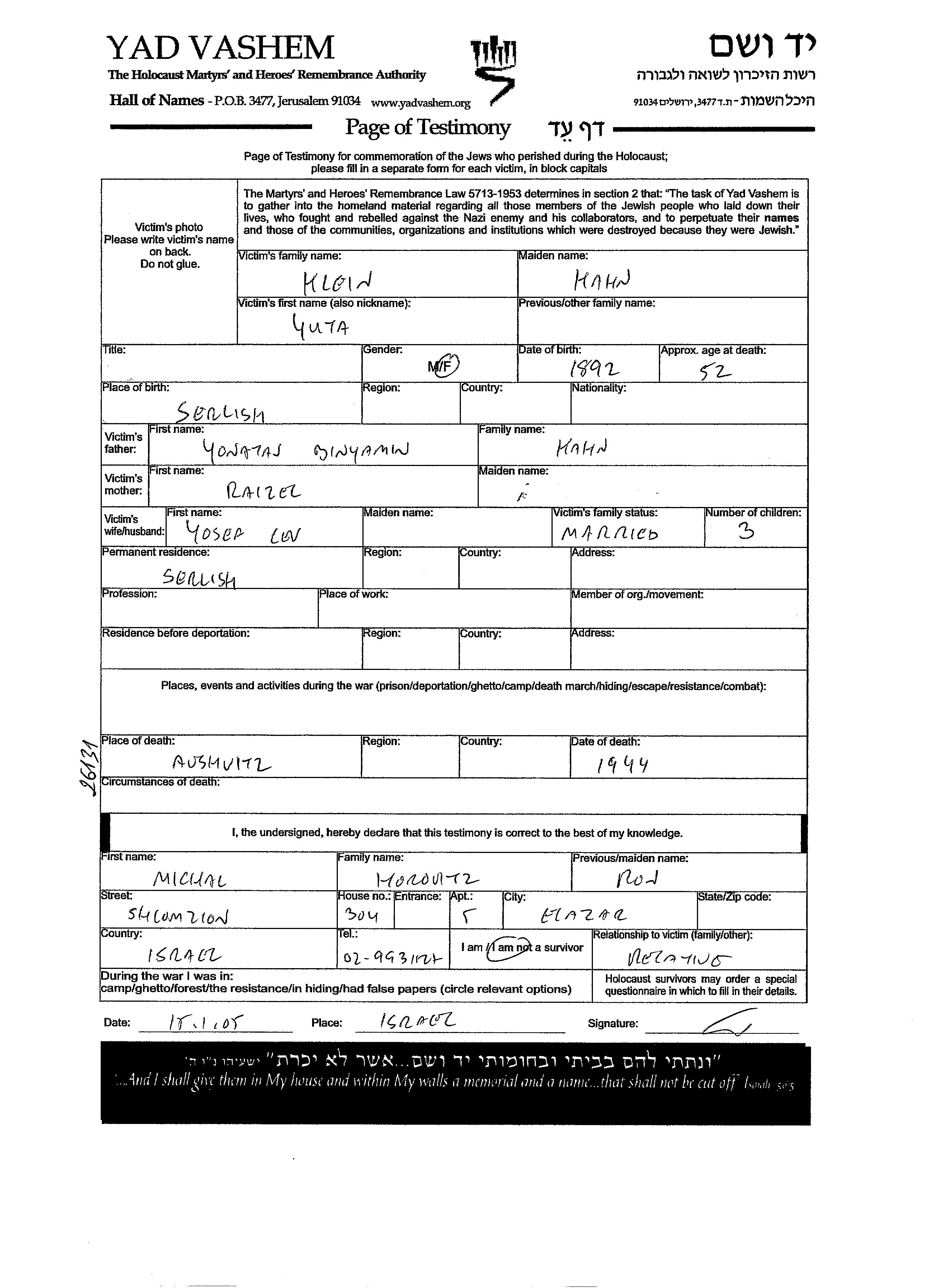Юта Клейн, девичья фамилия Хан, место рождения: Севлюш, Чехословакия. Отец: Ионатан Биньямин, mать:Райзел. Женат / замужем. Место жительства до войны: Севлюш, Чехословакия. Место во время войны: Севлюш, Чехословакия.