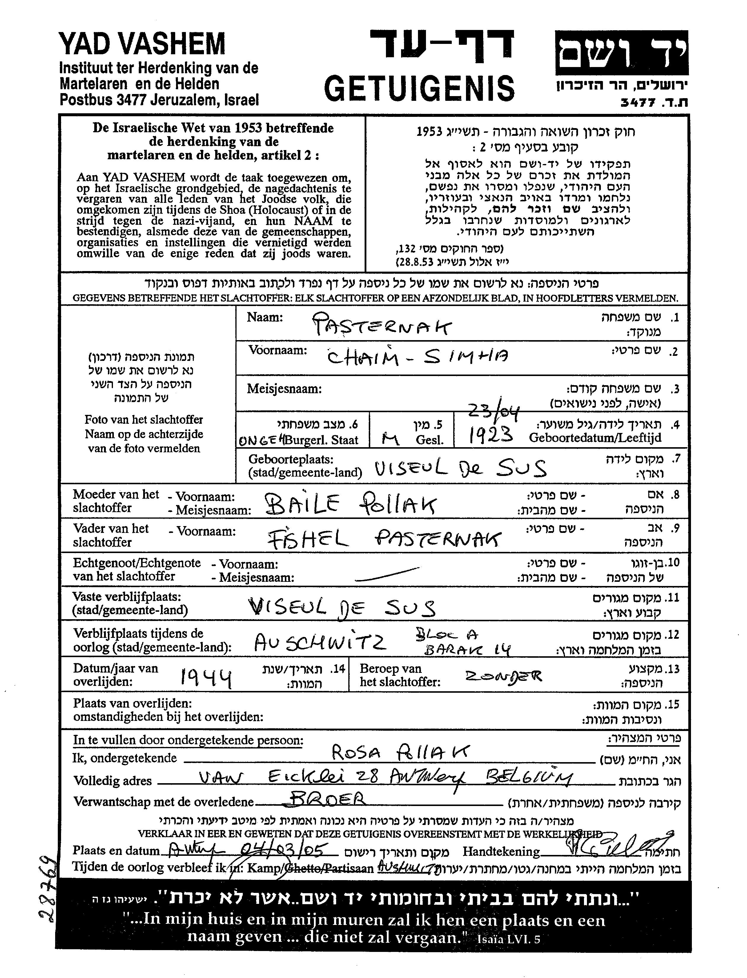 Симха Хаим Пастернак, место рождения: Вишеу-де-Сус, Румыния. Отец: Фишель, mать:Байле, девичья фамилия Поллак. Холост / не замужем. Место жительства до войны: Вишеу-де-Сус, Румыния. Место во время войны: Вишеу-де-Сус, Румыния.