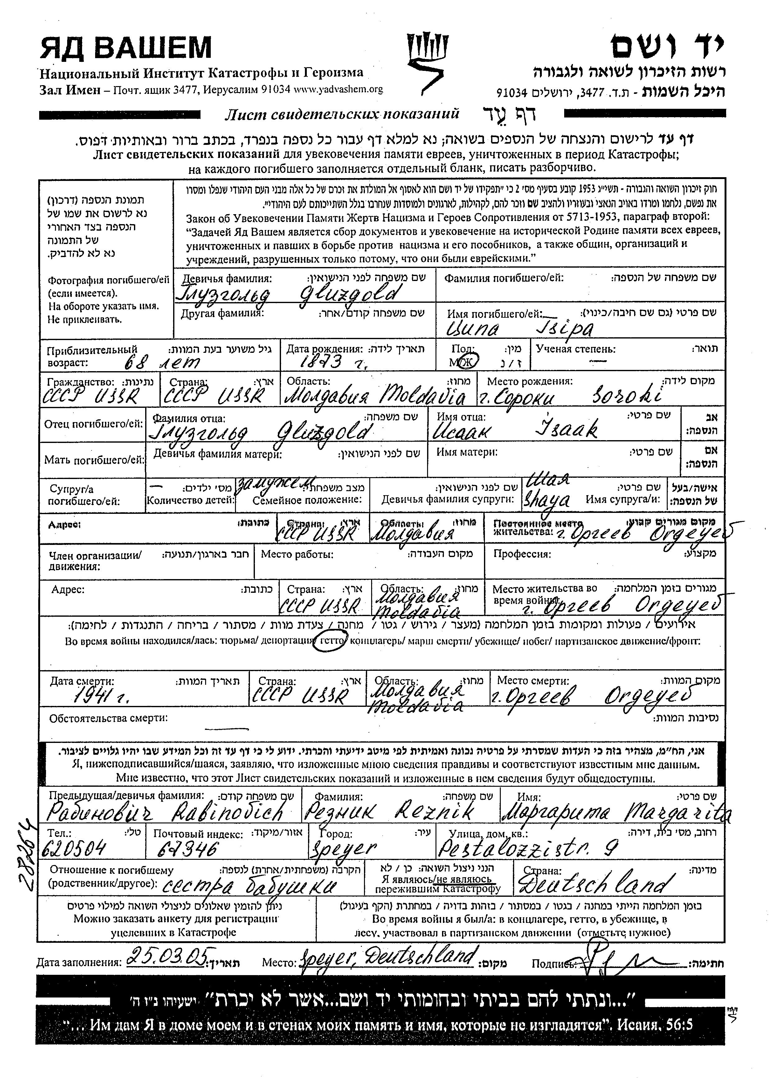 Яд Вашем - Листы свидетельских показаний Мемориального фонда