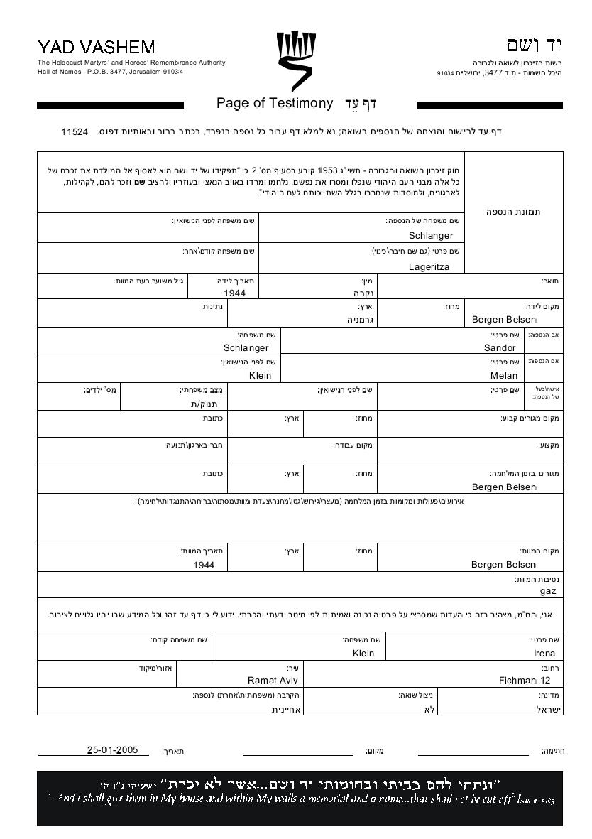 Lageritza Шлангер, место рождения: Берген-Бельзен, Германия. Отец: Шандор, mать:Мелан, девичья фамилия Клейн. Младенец. Место во время войны: Берген-Бельзен, Германия.