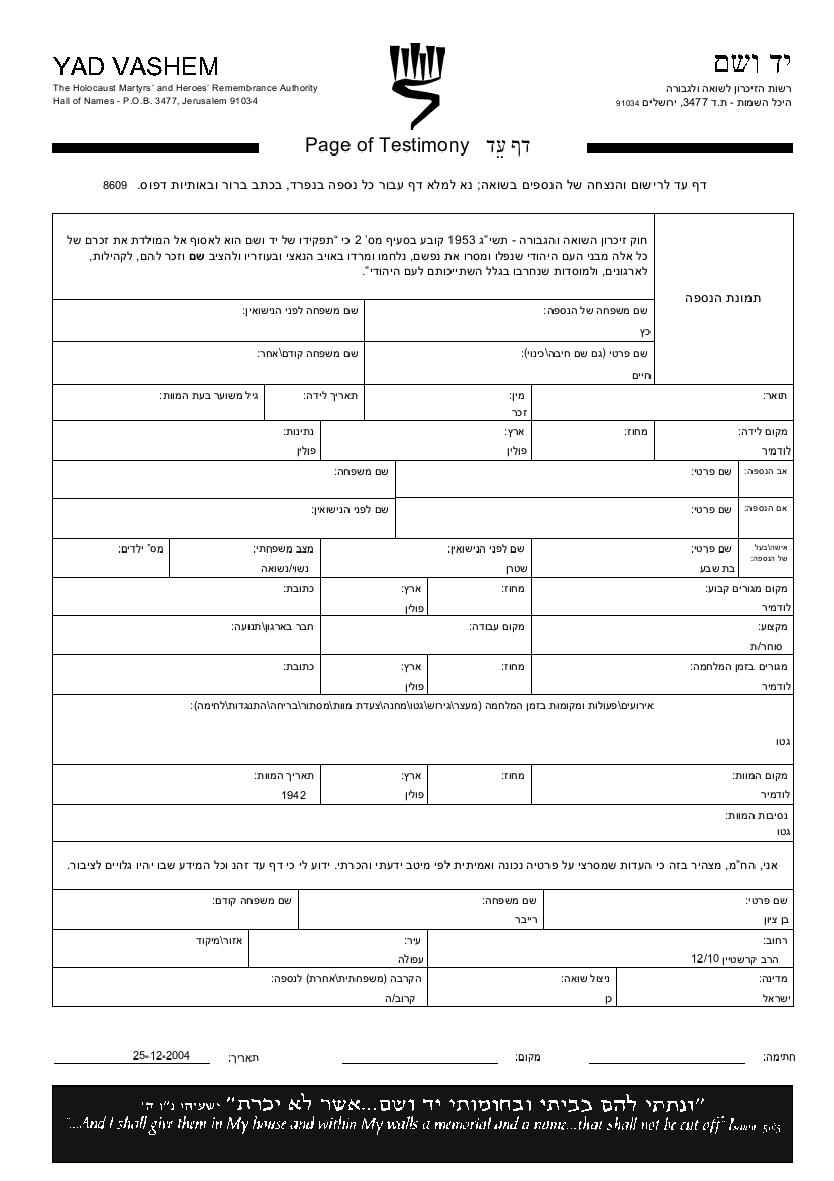Яд Вашем - Листы свидетельских показаний Мемориального фонда