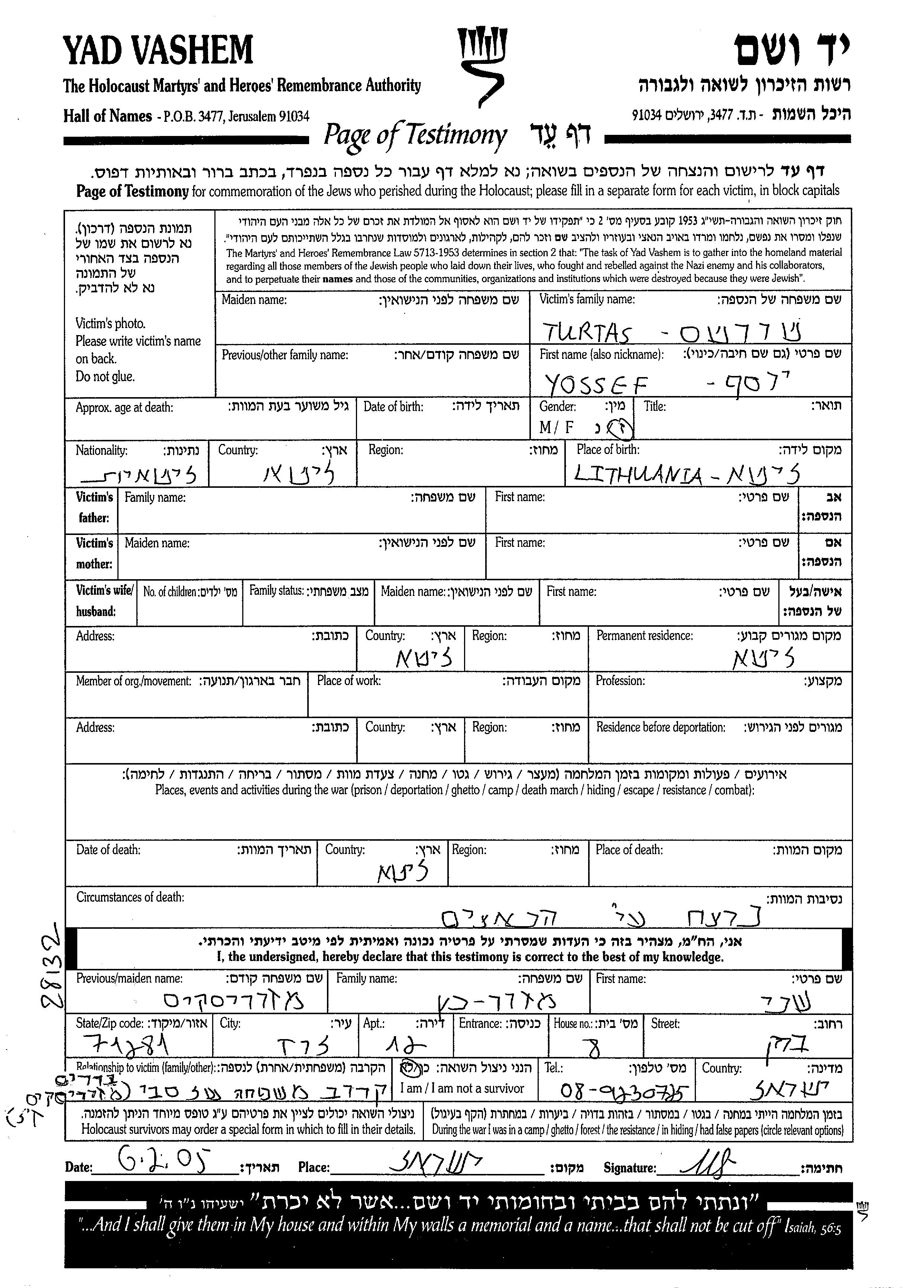Иосеф Turtas, место рождения: Литва. Место жительства до войны: Литва. Место во время войны: Литва.