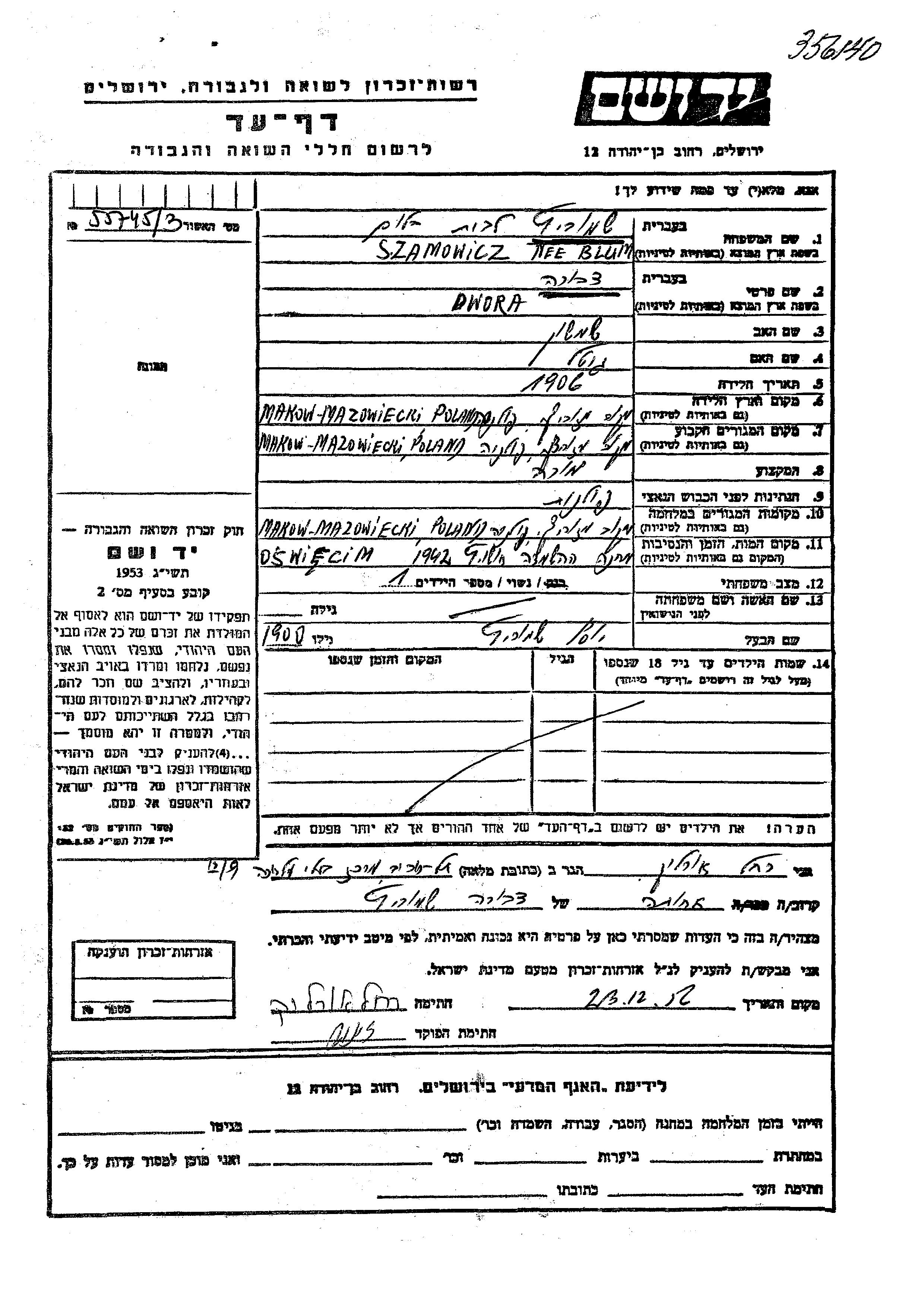 Шамович Двора 1906 Маков-Мазовецки, Польша Лист свидетельских показаний