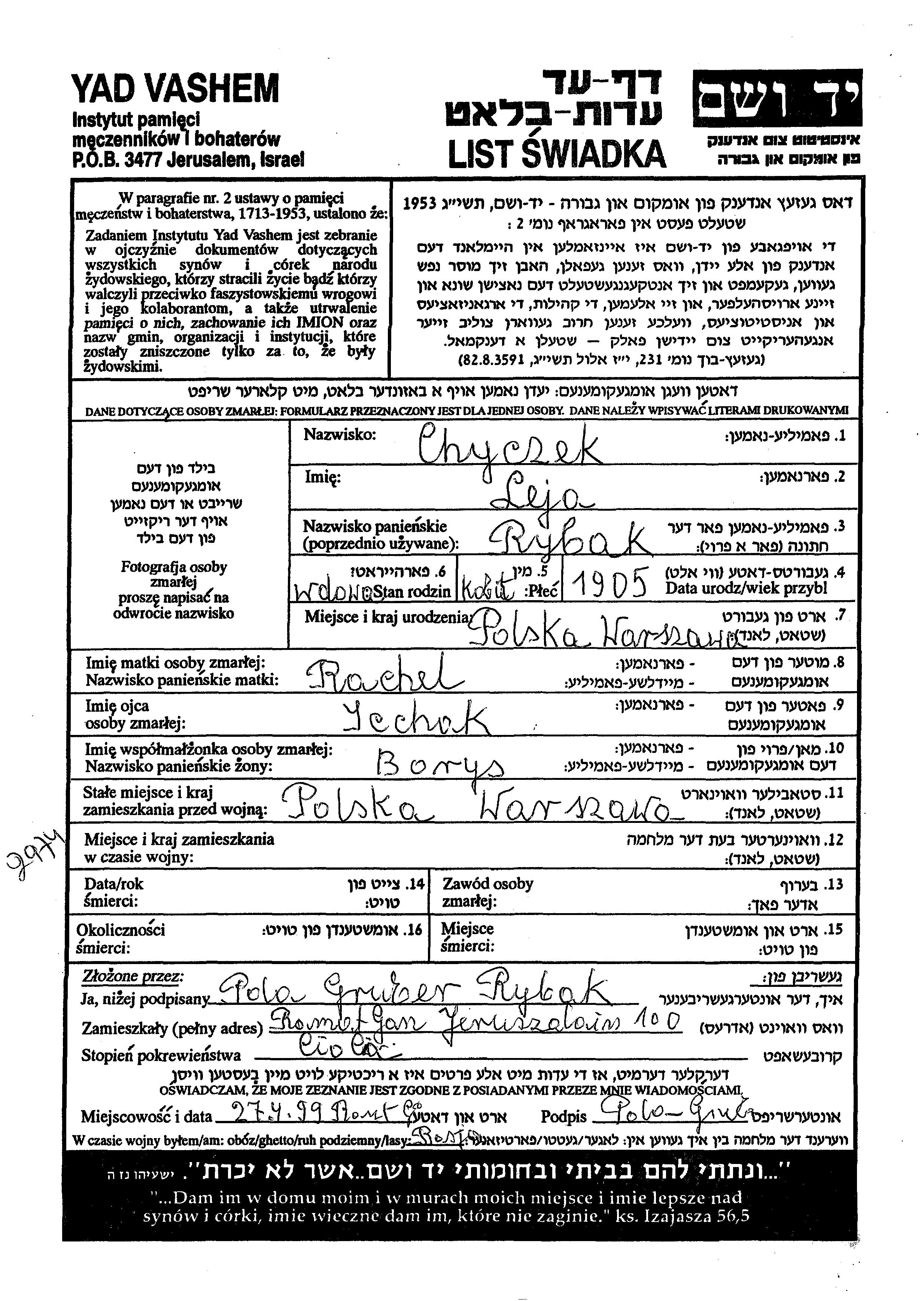 Лея Хичек, девичья фамилия Рыбак, место рождения: Варшава, Польша. Отец: Ицхак, mать:Рахель. Вдова. Место жительства до войны: Варшава, Польша. Место во время войны: Варшава, Польша.