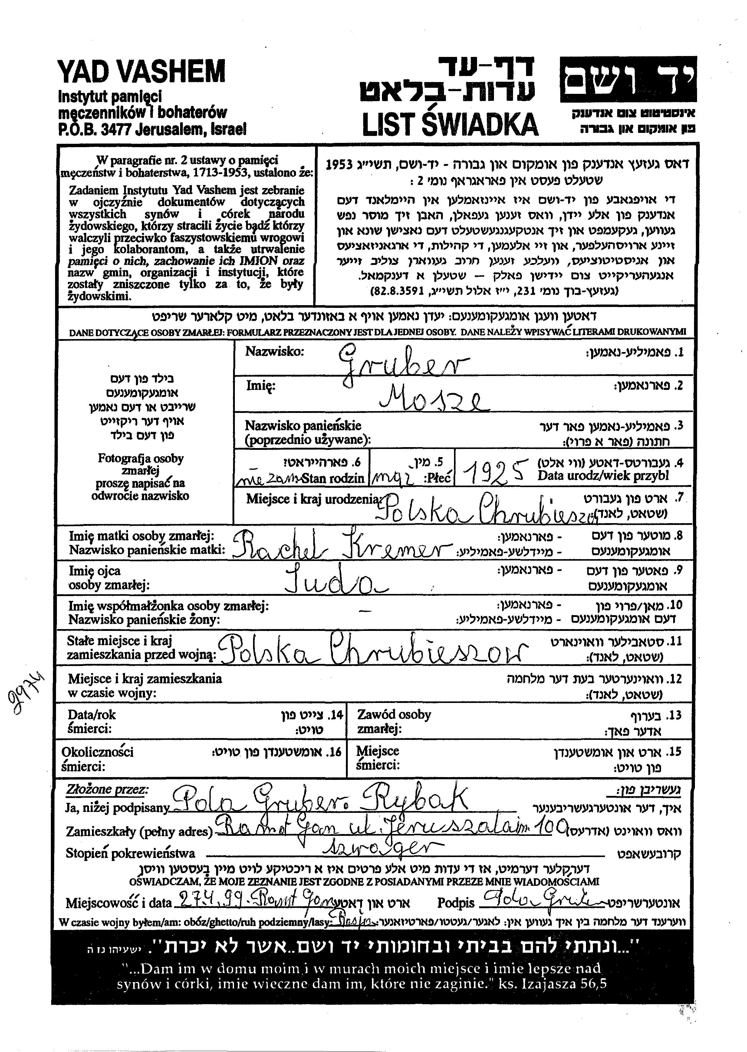 Грубер Моше 1925 Хрубешув, Польша Лист свидетельских показаний