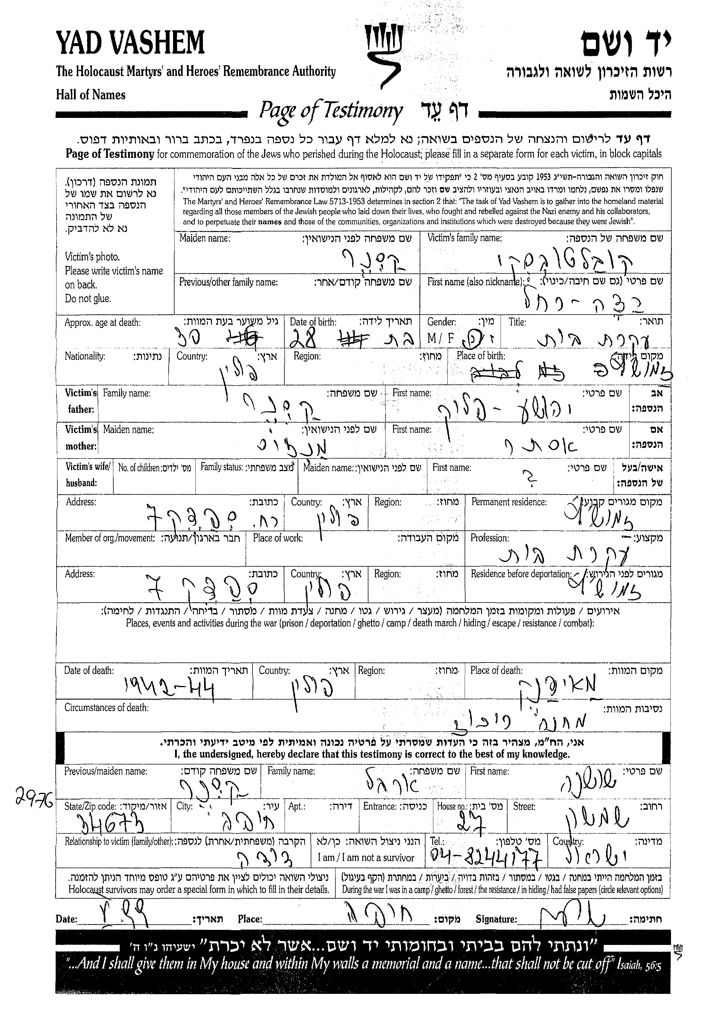 Яд Вашем - Листы свидетельских показаний Мемориального фонда