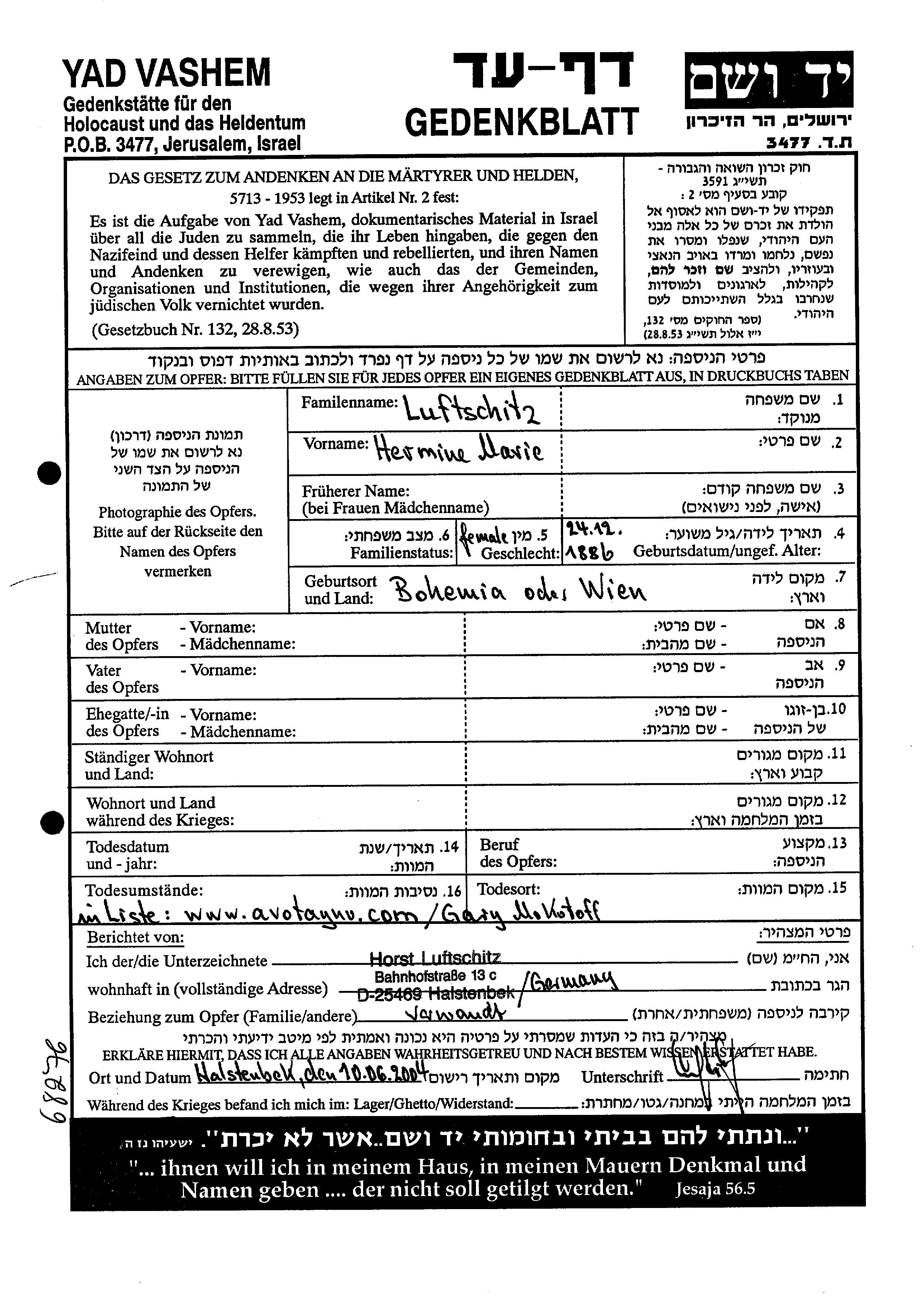 Люфтшиц Хермине Мари 1886 место не указано, Лист свидетельских показаний