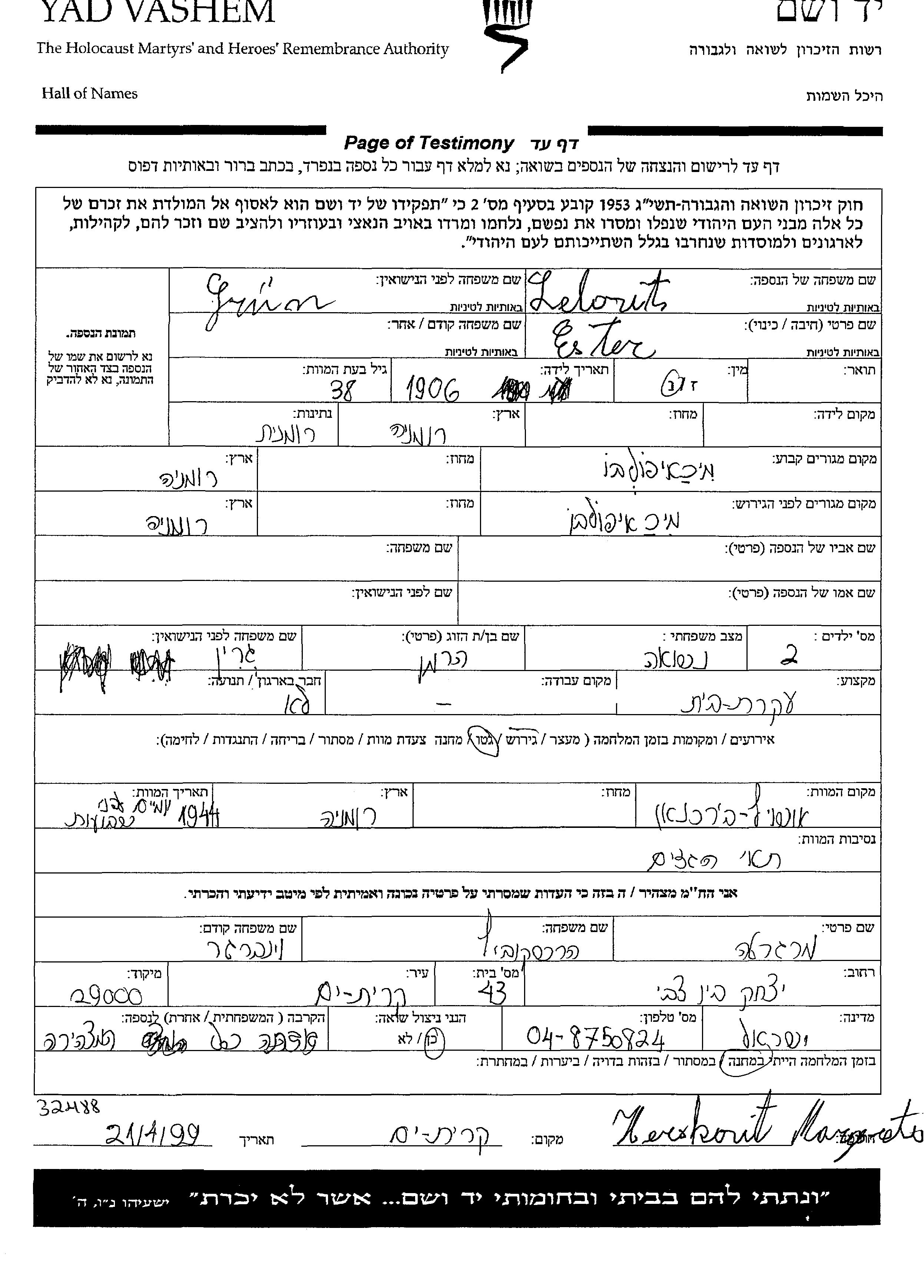 Эстер Лебовиц, девичья фамилия Гринн, место рождения: Румыния. Домохозяйка. Женат / замужем. Место жительства до войны: Ермихойфальва, Румыния. Место во время войны: ГЕТТО.