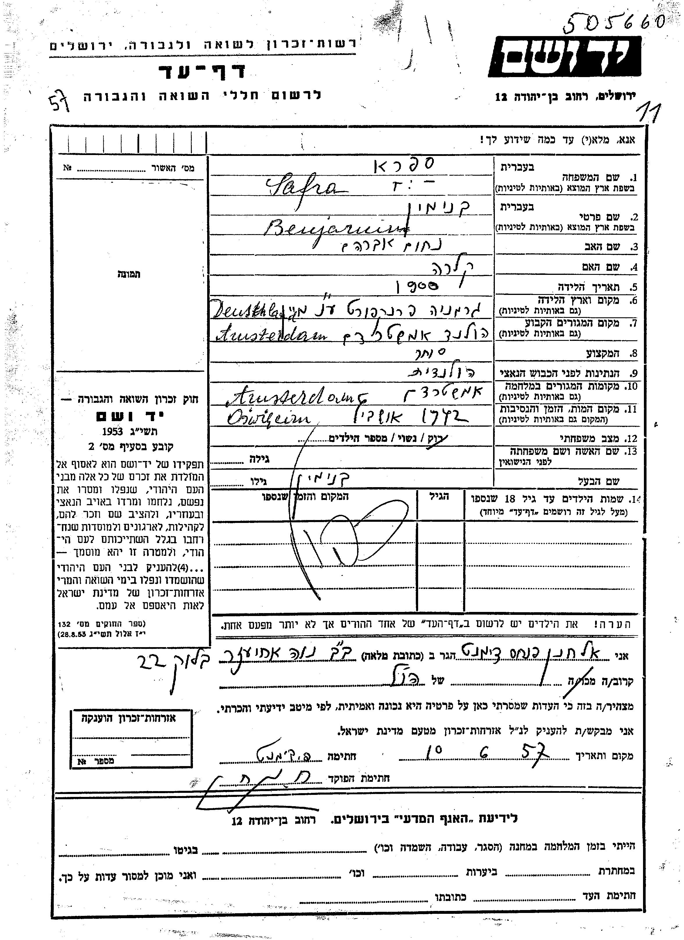 Сафра Беньямин 1900 Амстердам, Нидерланды Лист свидетельских показаний
