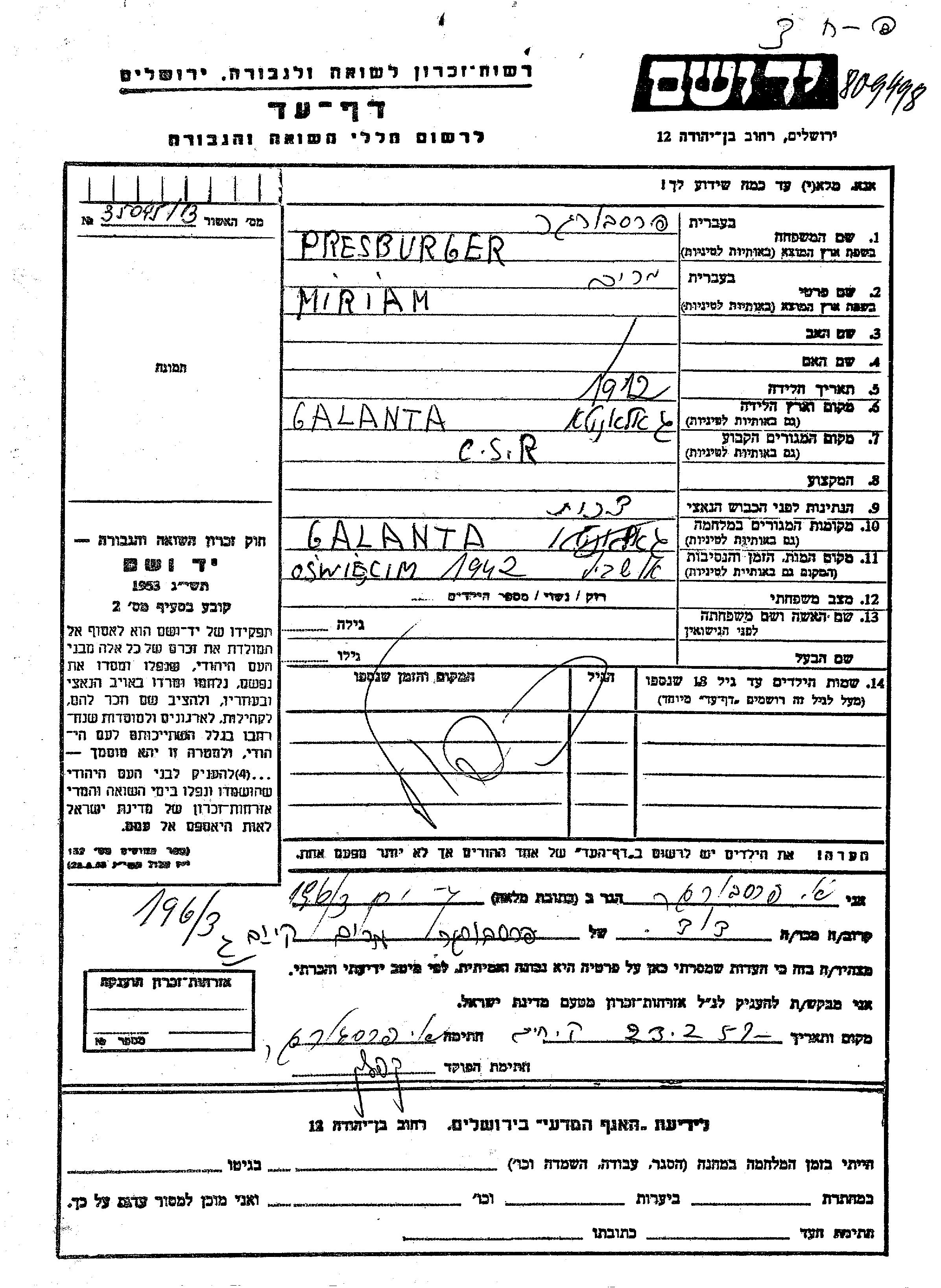 Пресбургер Мирьям 1912 Галанта, Чехословакия Лист свидетельских показаний