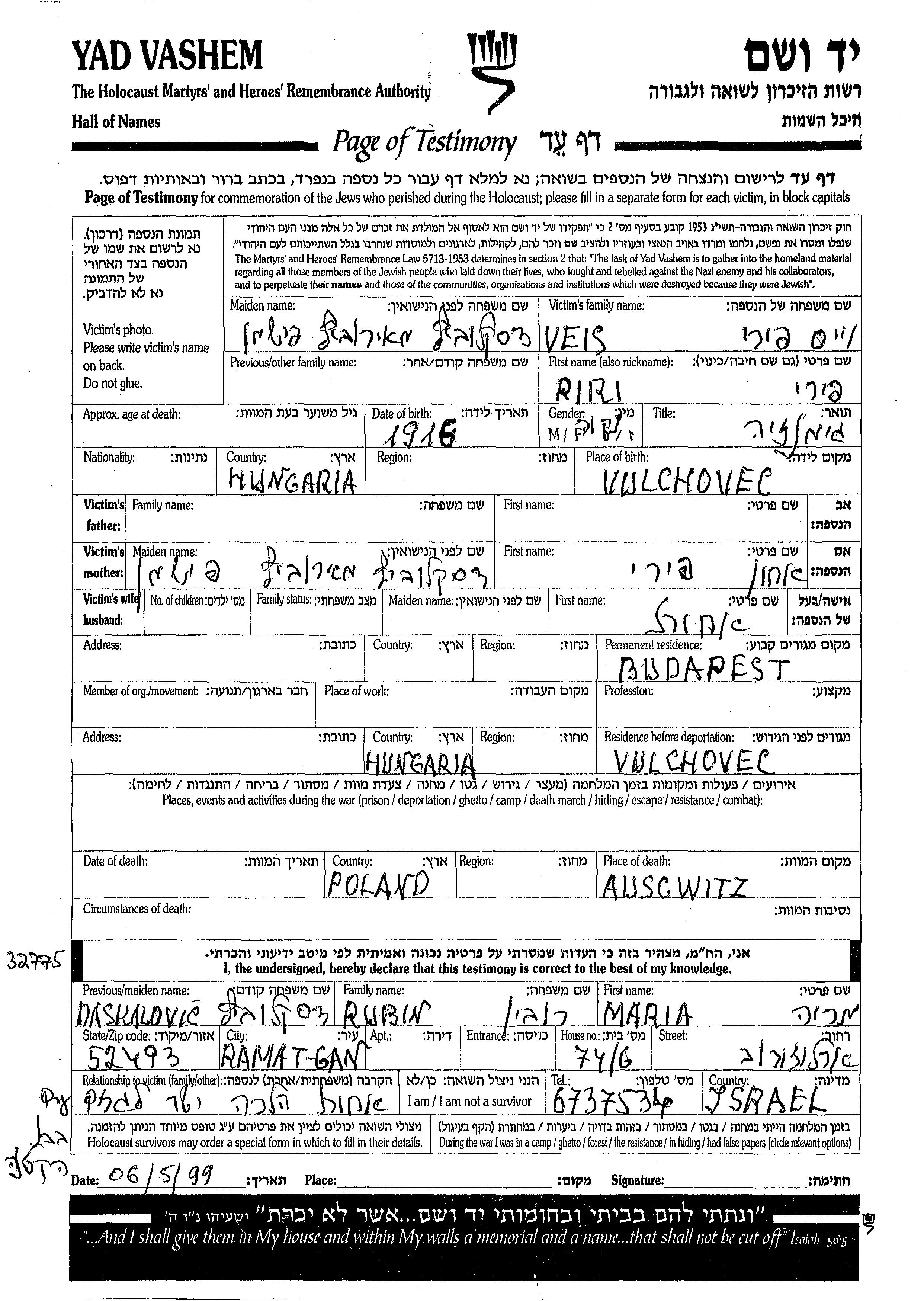 Яд Вашем - Листы свидетельских показаний Мемориального фонда