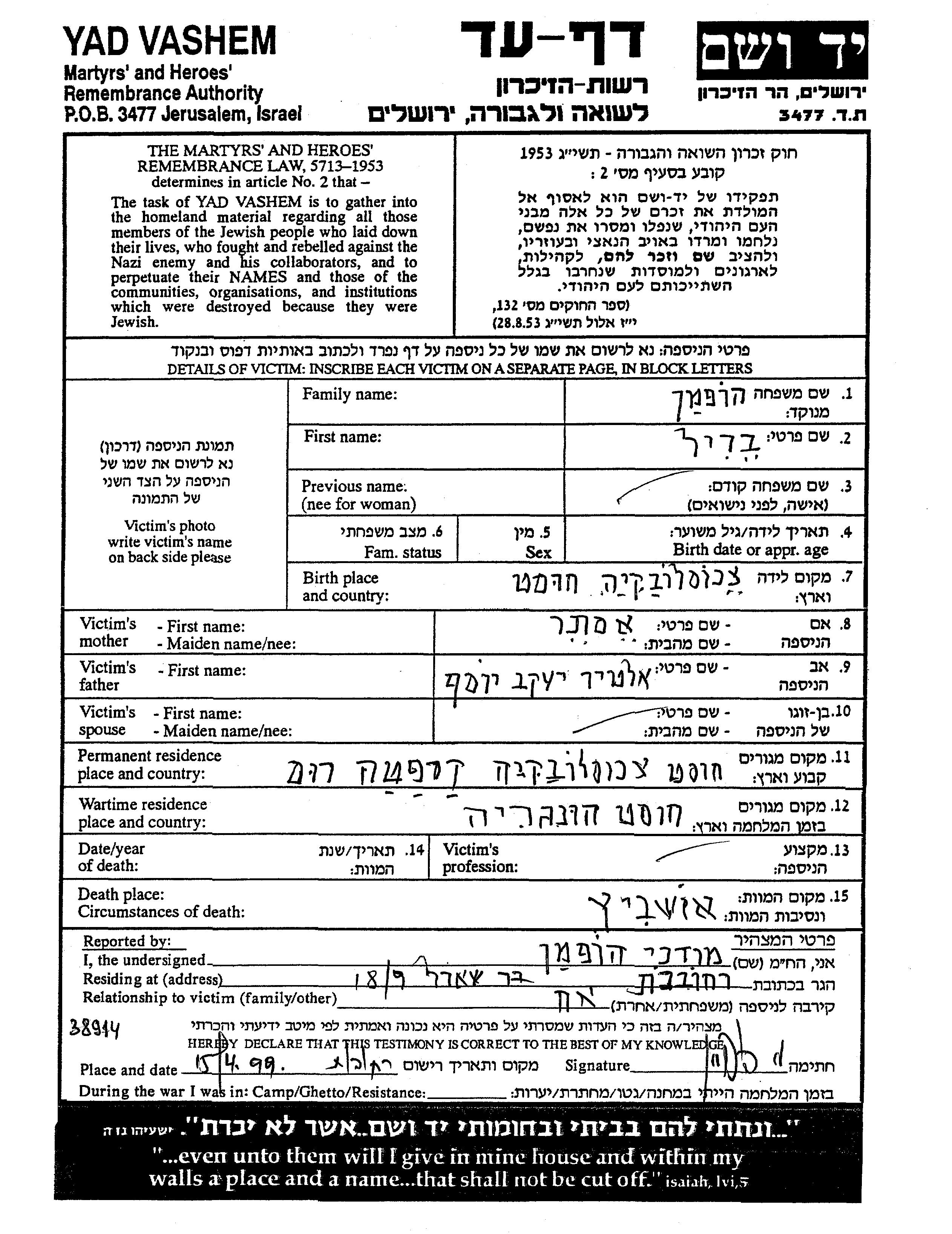 Яд Вашем - Листы свидетельских показаний Мемориального фонда