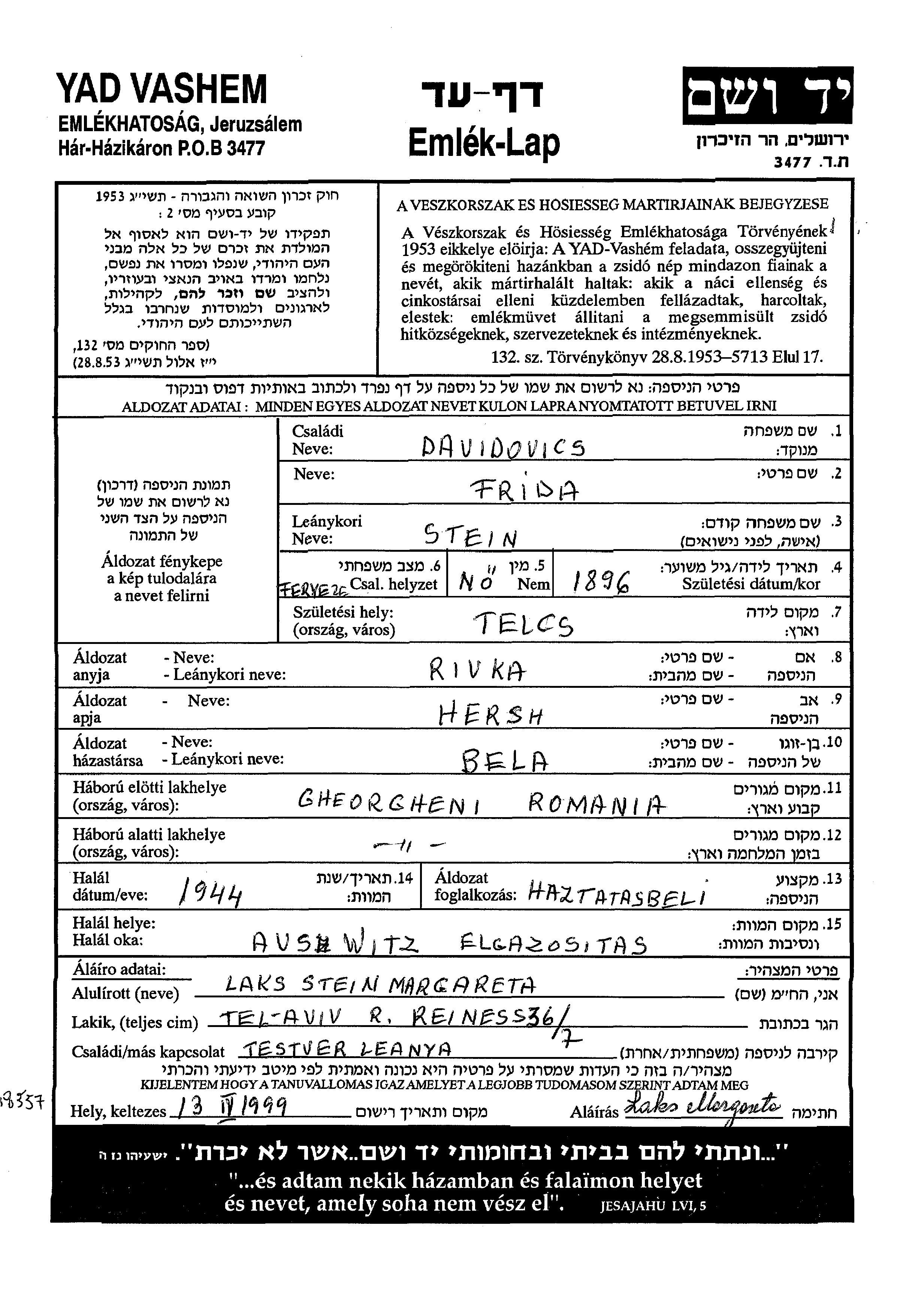 Фрида Давидович, девичья фамилия Штайн, место рождения: Тельч, Румыния. Отец: Герш, mать:Ривка. Домохозяйка. Женат / замужем. Место жительства до войны: Георгень, Румыния. Место во время войны: Георгень, Румыния.