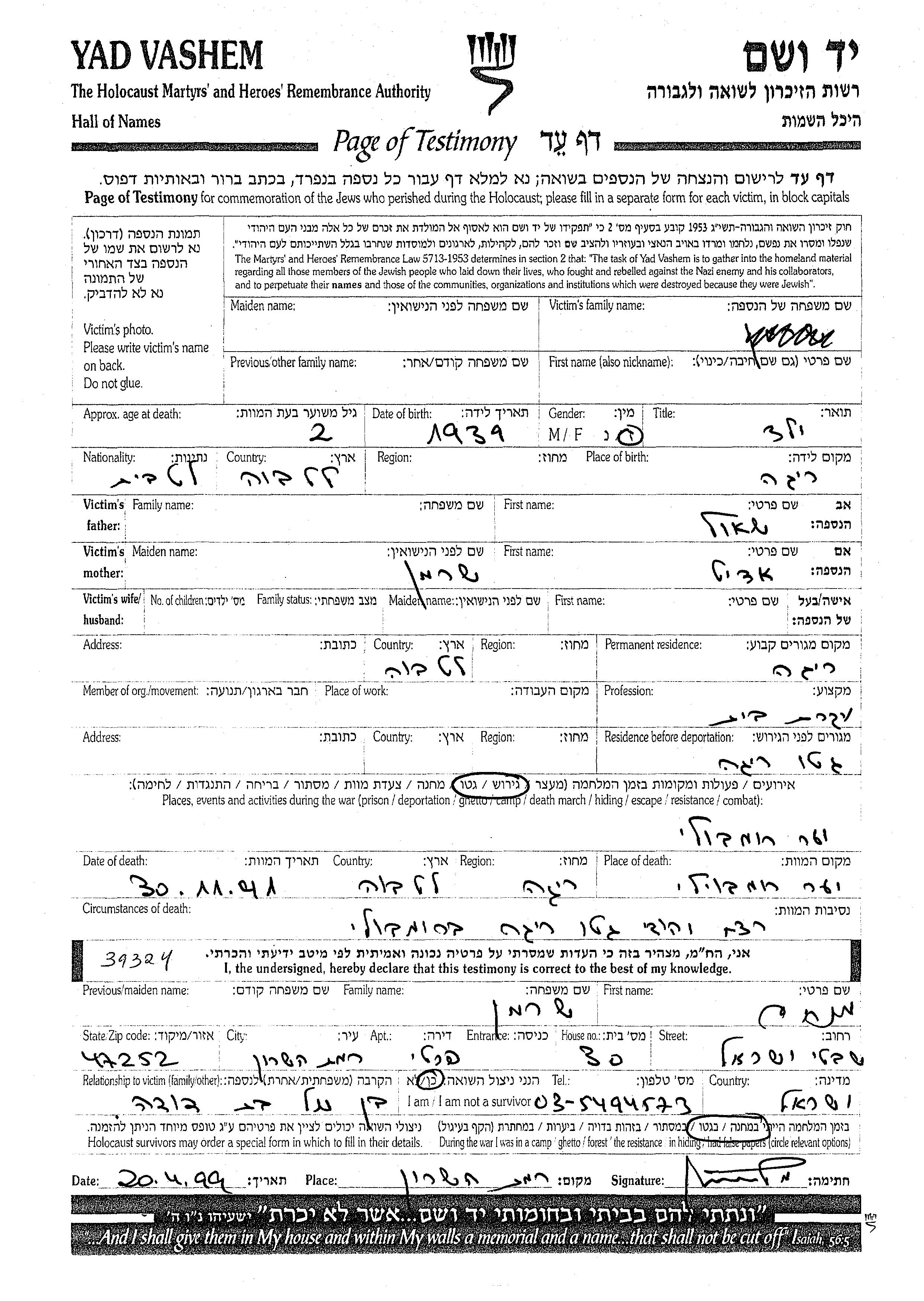 Яд Вашем - Листы свидетельских показаний Мемориального фонда