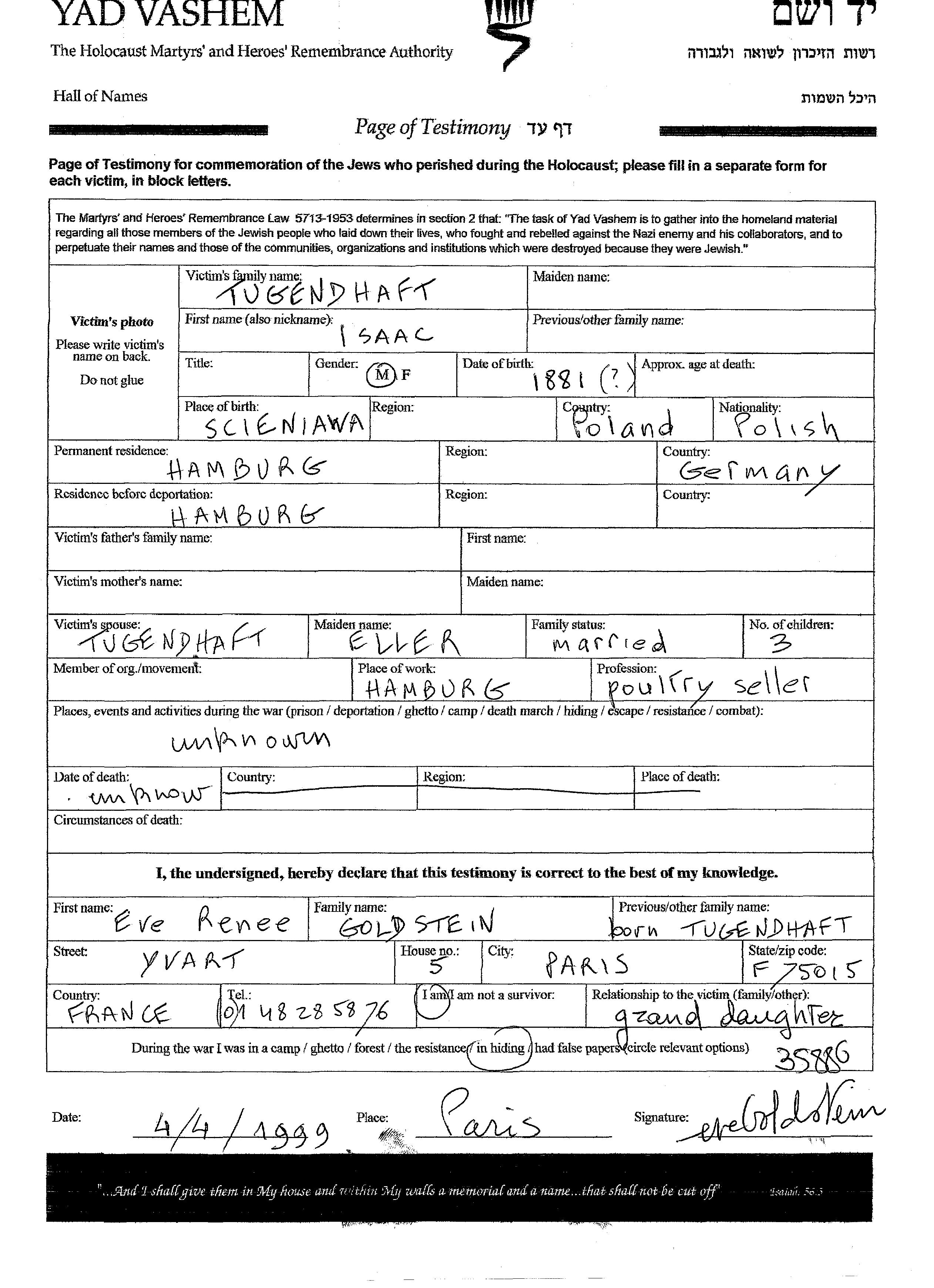 Исаак Тугендхафт, место рождения: Сенява, Польша. Торговец домашней птицей. Женат / замужем. Место жительства до войны: Гамбург, Германия. Место во время войны: Гамбург, Германия.