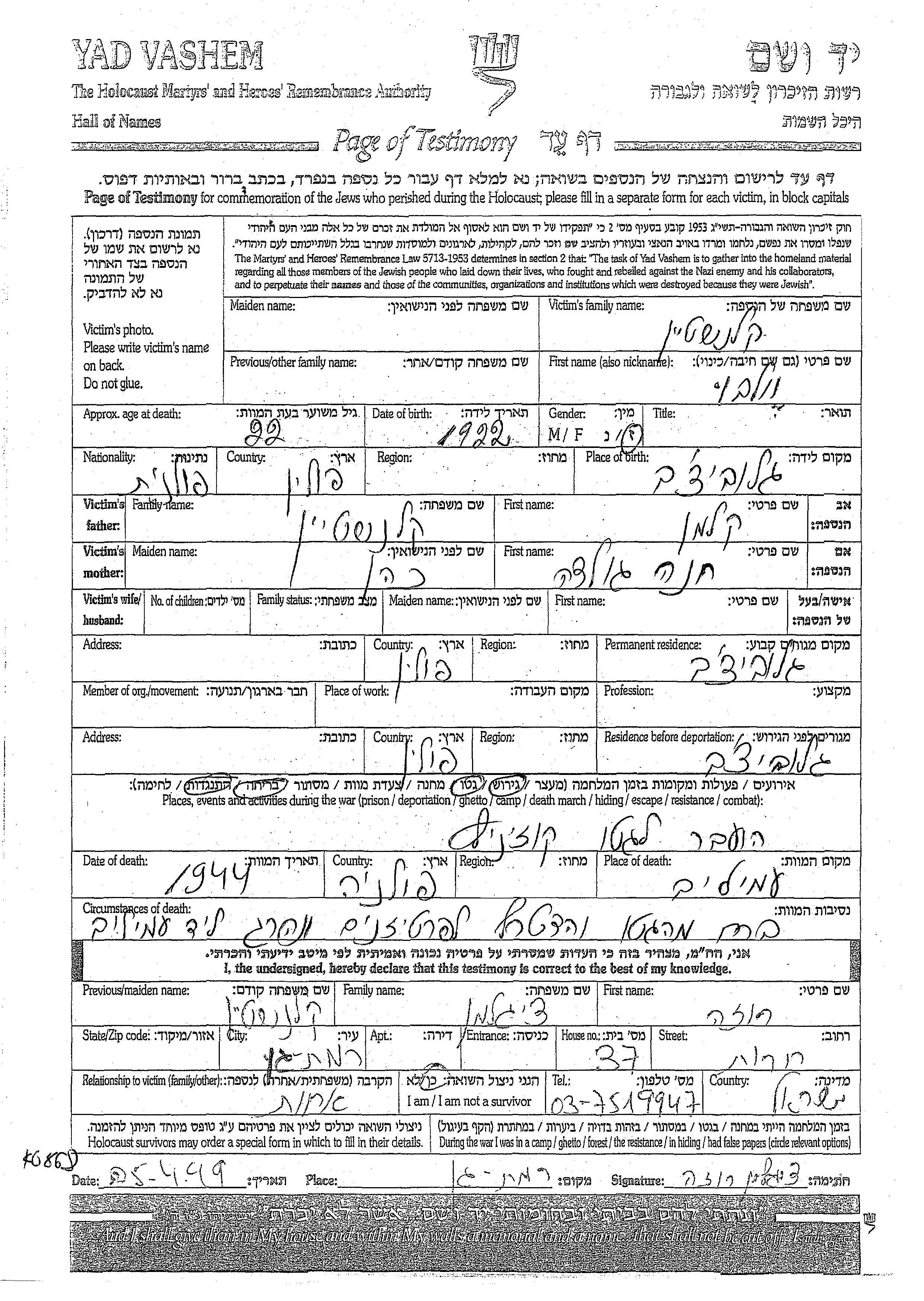 Яд Вашем - Листы свидетельских показаний Мемориального фонда