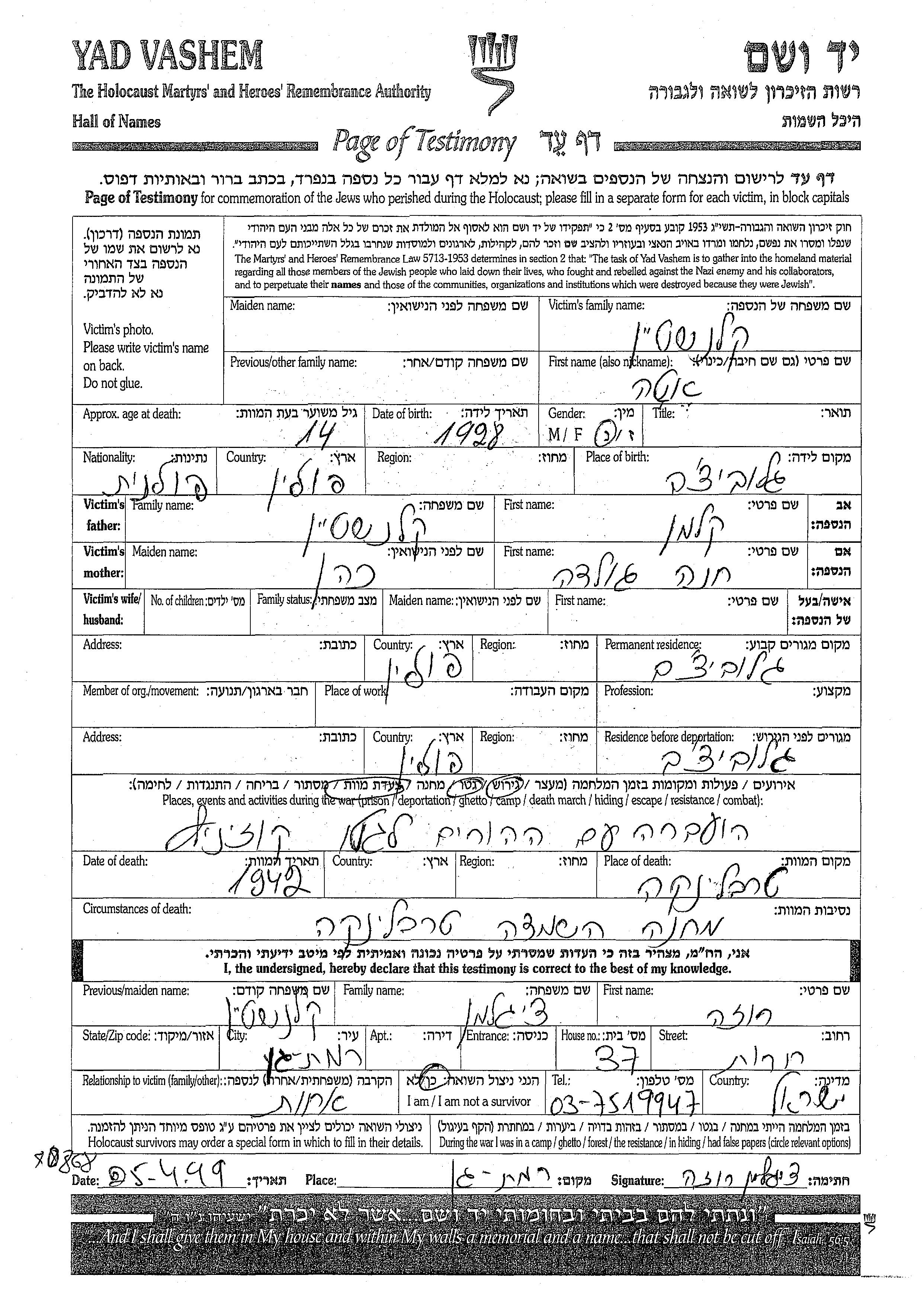 Яд Вашем - Листы свидетельских показаний Мемориального фонда