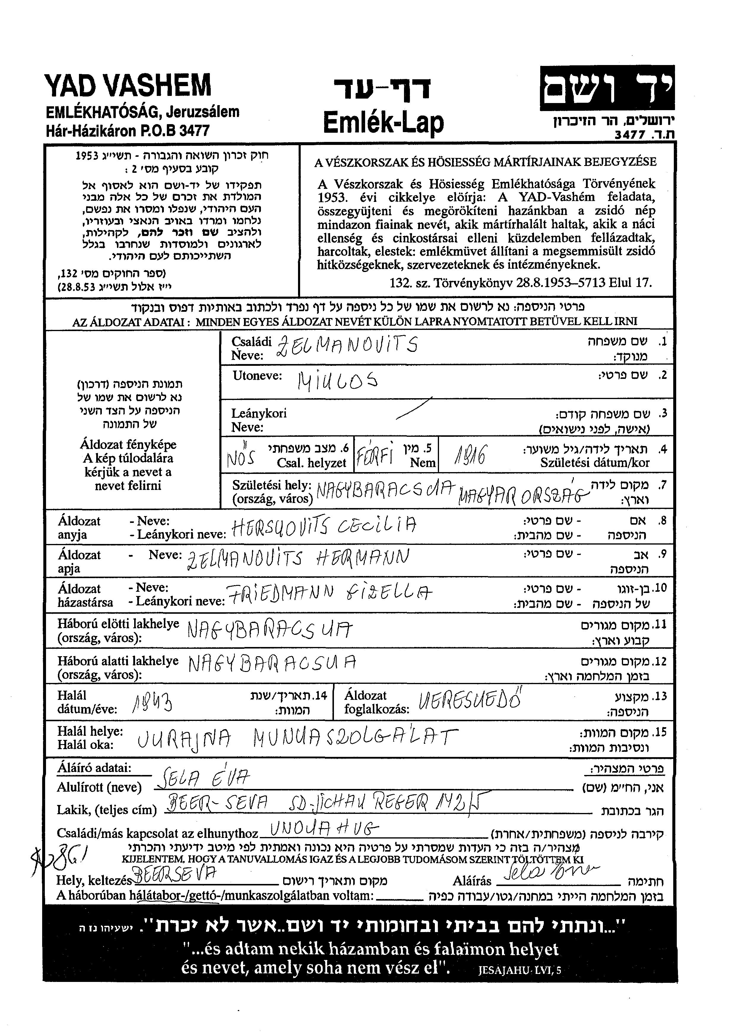 Миклош Зельмановиц, место рождения: Надьбарачка, Венгрия. Отец: Херманн, mать:Цецилия, девичья фамилия Хершковиц. Торговец / торговка. Женат / замужем. Место жительства до войны: Надьбарачка, Венгрия. Место во время войны: Вооруженные силы Венгрии - труд батальоны.