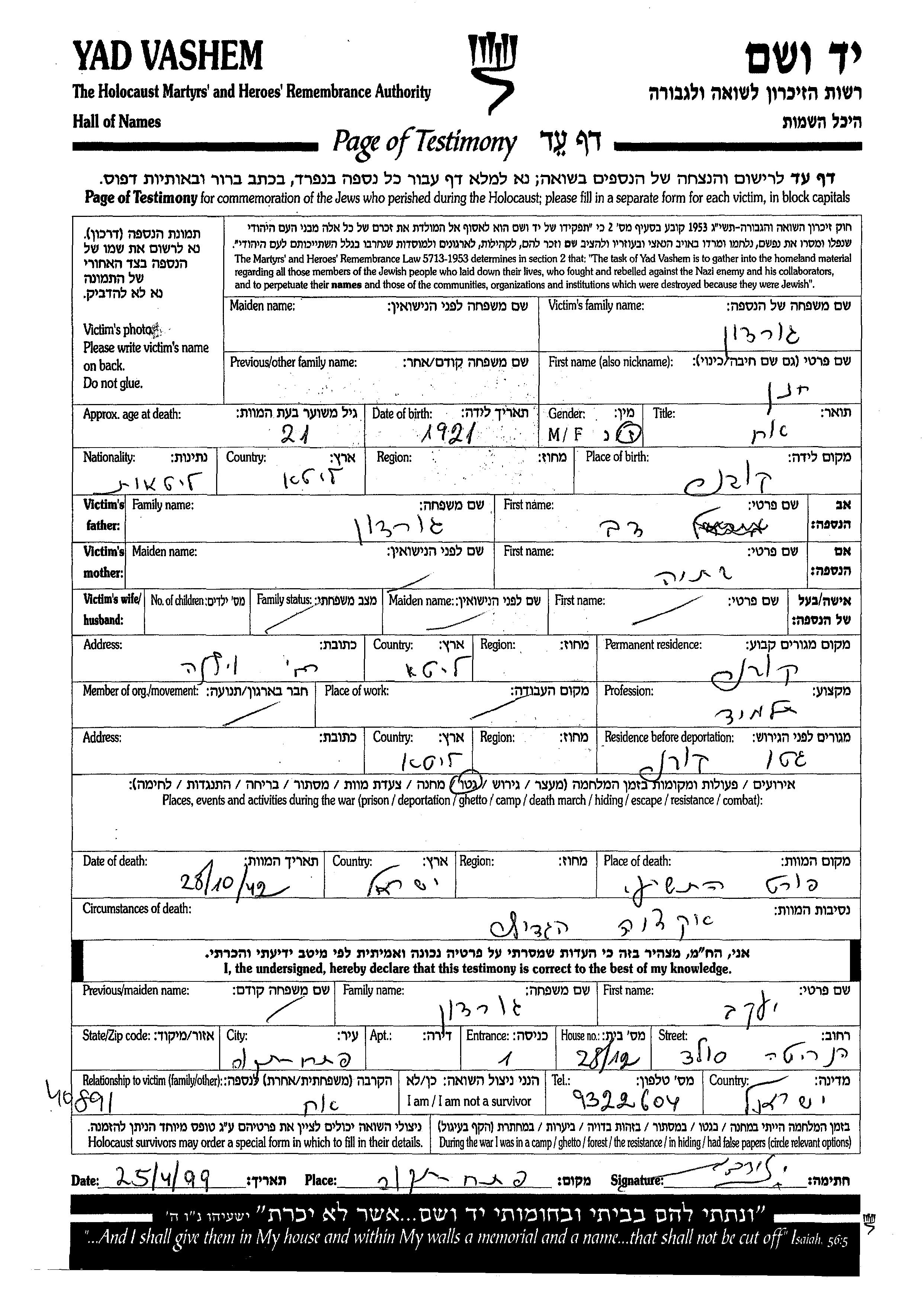 Яд Вашем - Листы свидетельских показаний Мемориального фонда