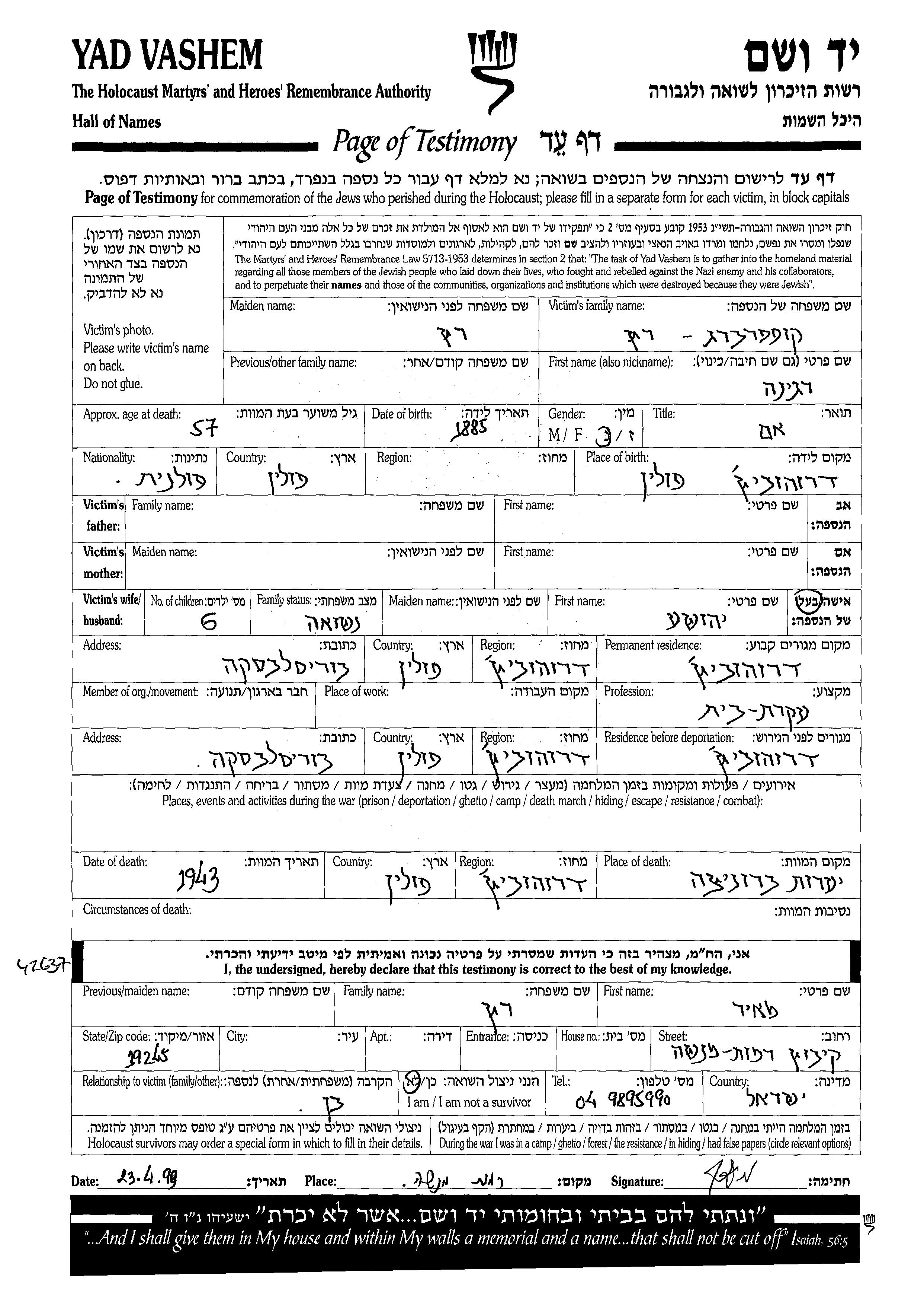 Яд Вашем - Листы свидетельских показаний Мемориального фонда