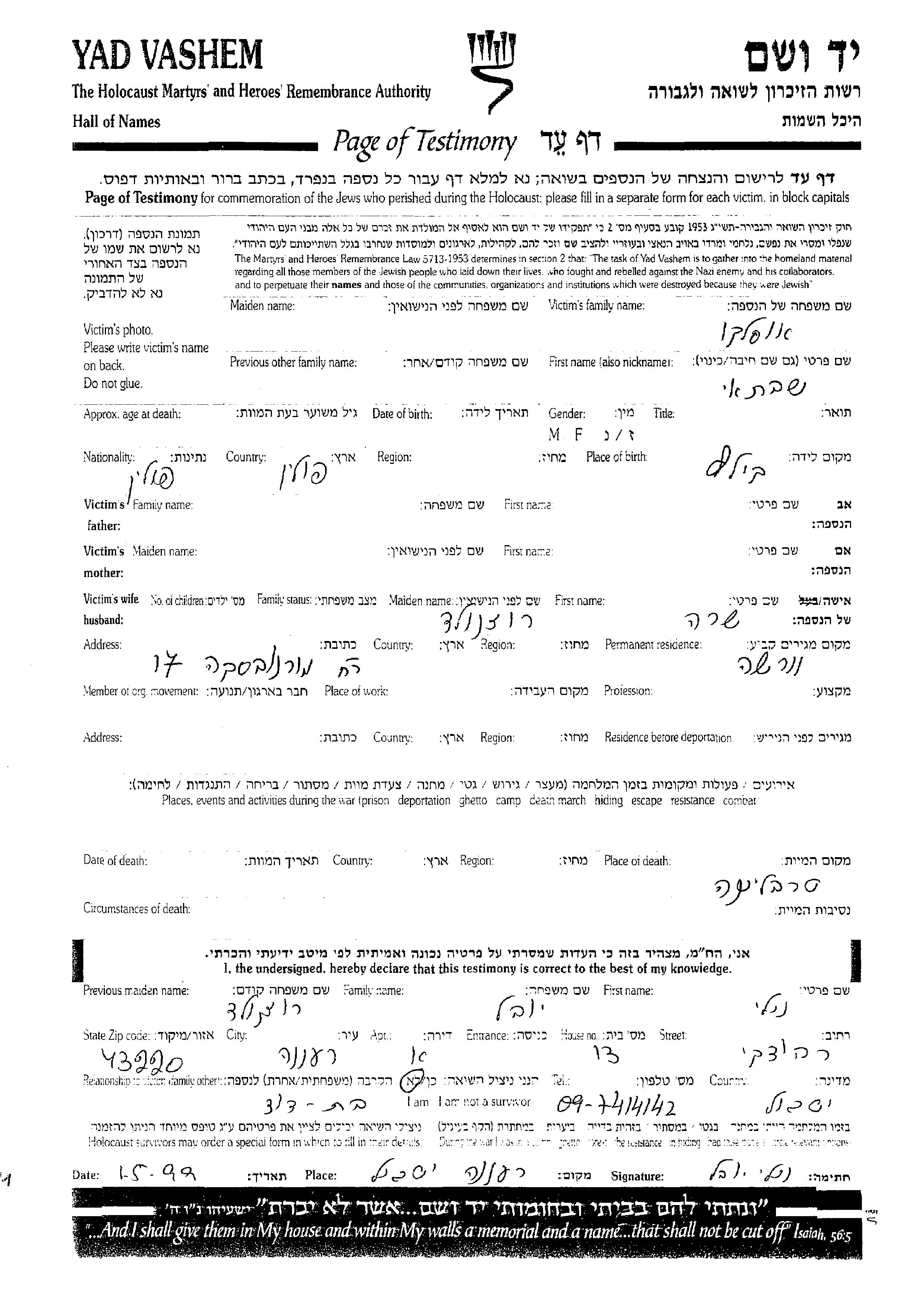 Оселка Шабтай Варшава, Польша Лист свидетельских показаний