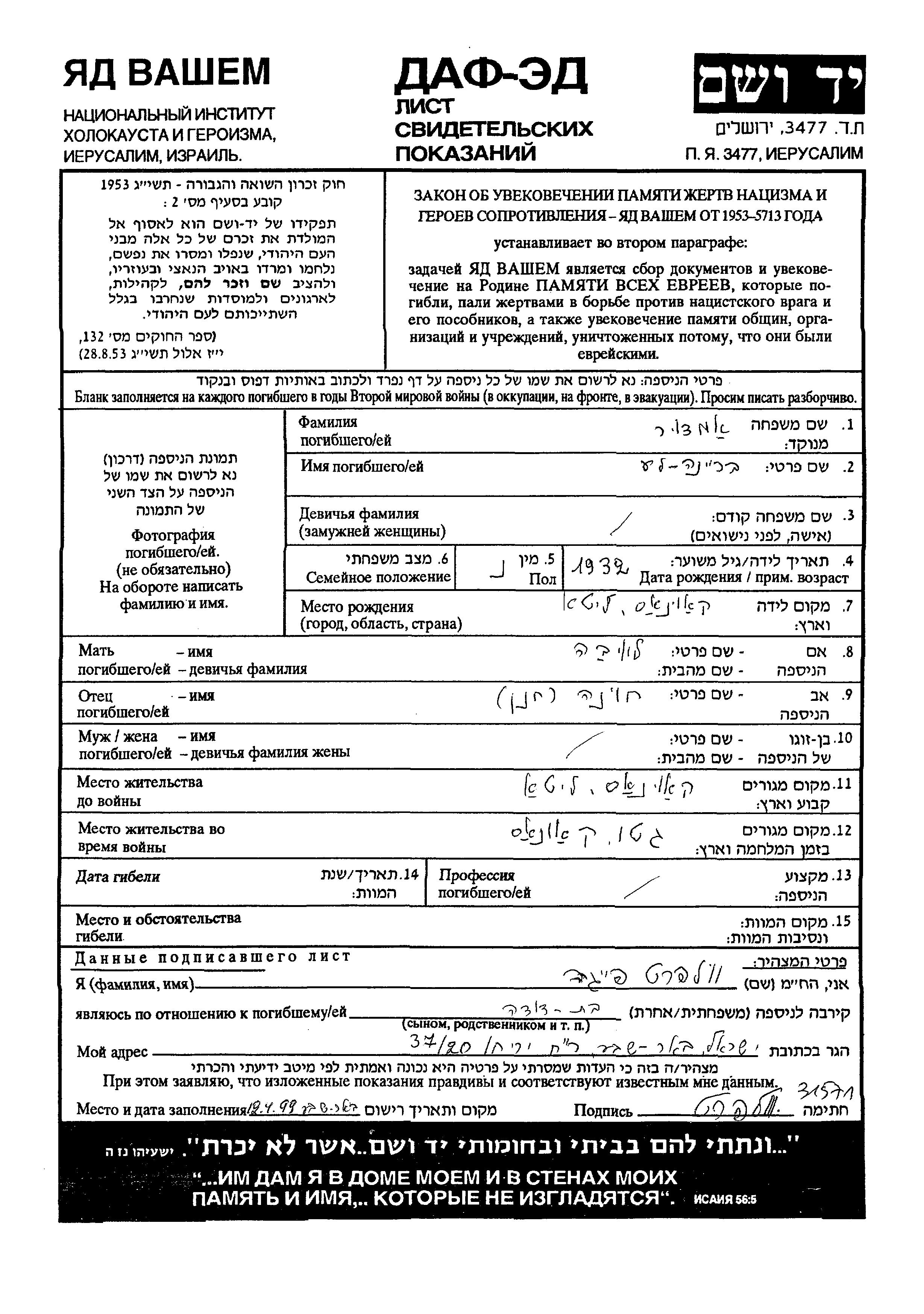 Яд Вашем - Листы свидетельских показаний Мемориального фонда