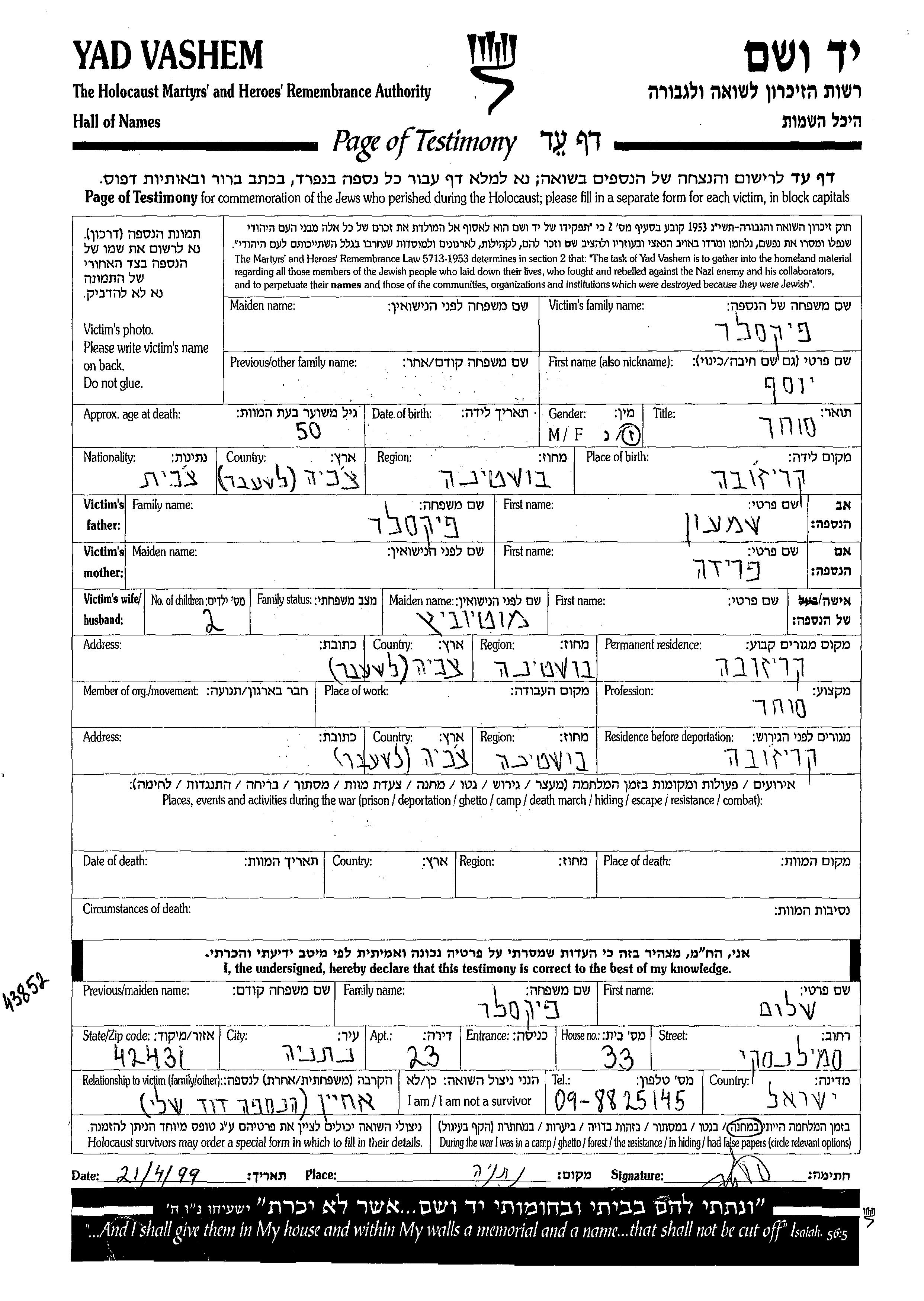 Яд Вашем - Листы свидетельских показаний Мемориального фонда