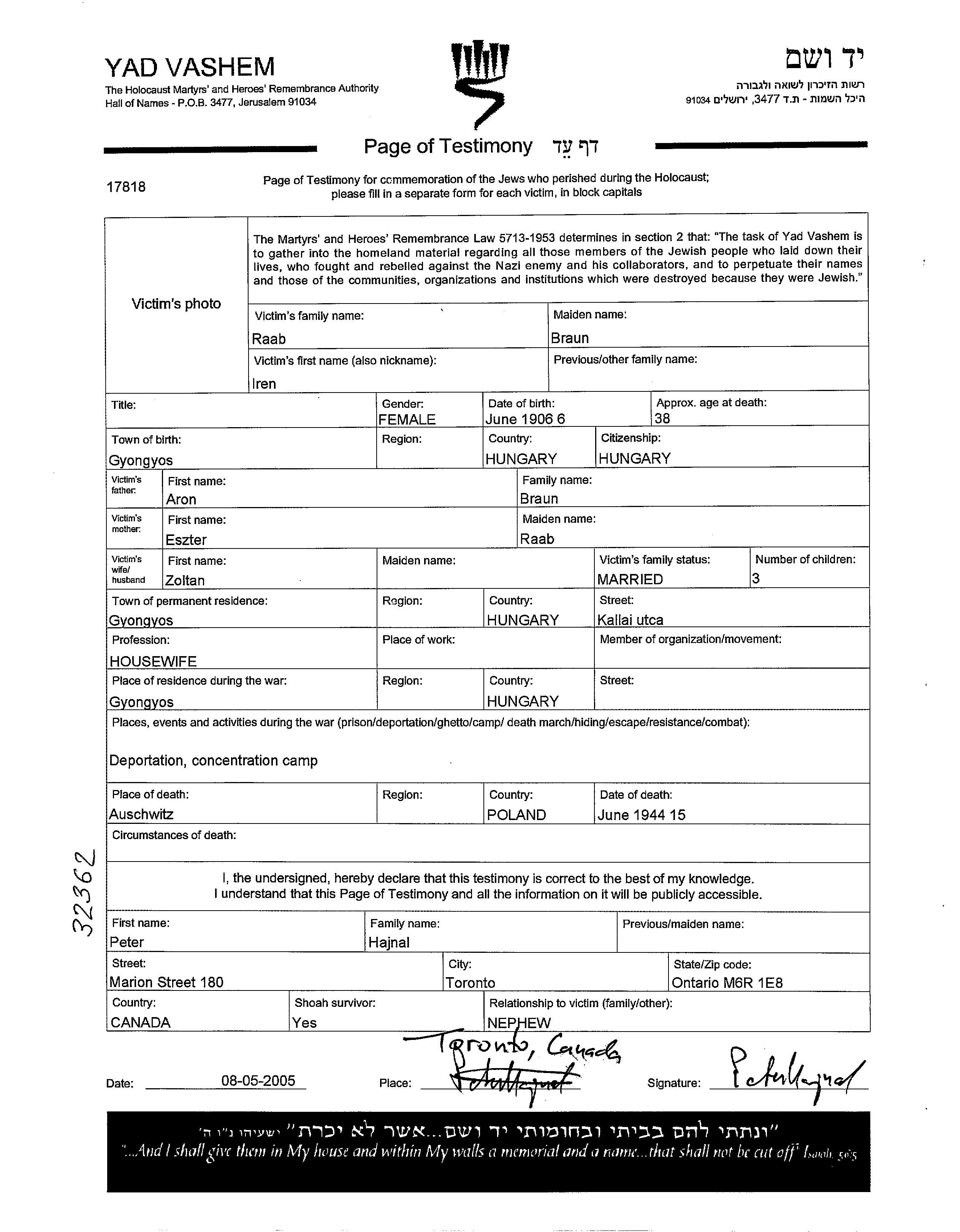 Ирен Рааб, девичья фамилия Браун, место рождения: Дьёндьёш, Венгрия. Отец: Арон, mать:Эстер, девичья фамилия Рааб. Домохозяйка. Женат / замужем. Место жительства до войны: Дьёндьёш, Венгрия. Место во время войны: Дьёндьёш, Венгрия. Ирен уничтоженa в период Шоа. место смерти: Аушвиц, Польша в 15/06/1944.