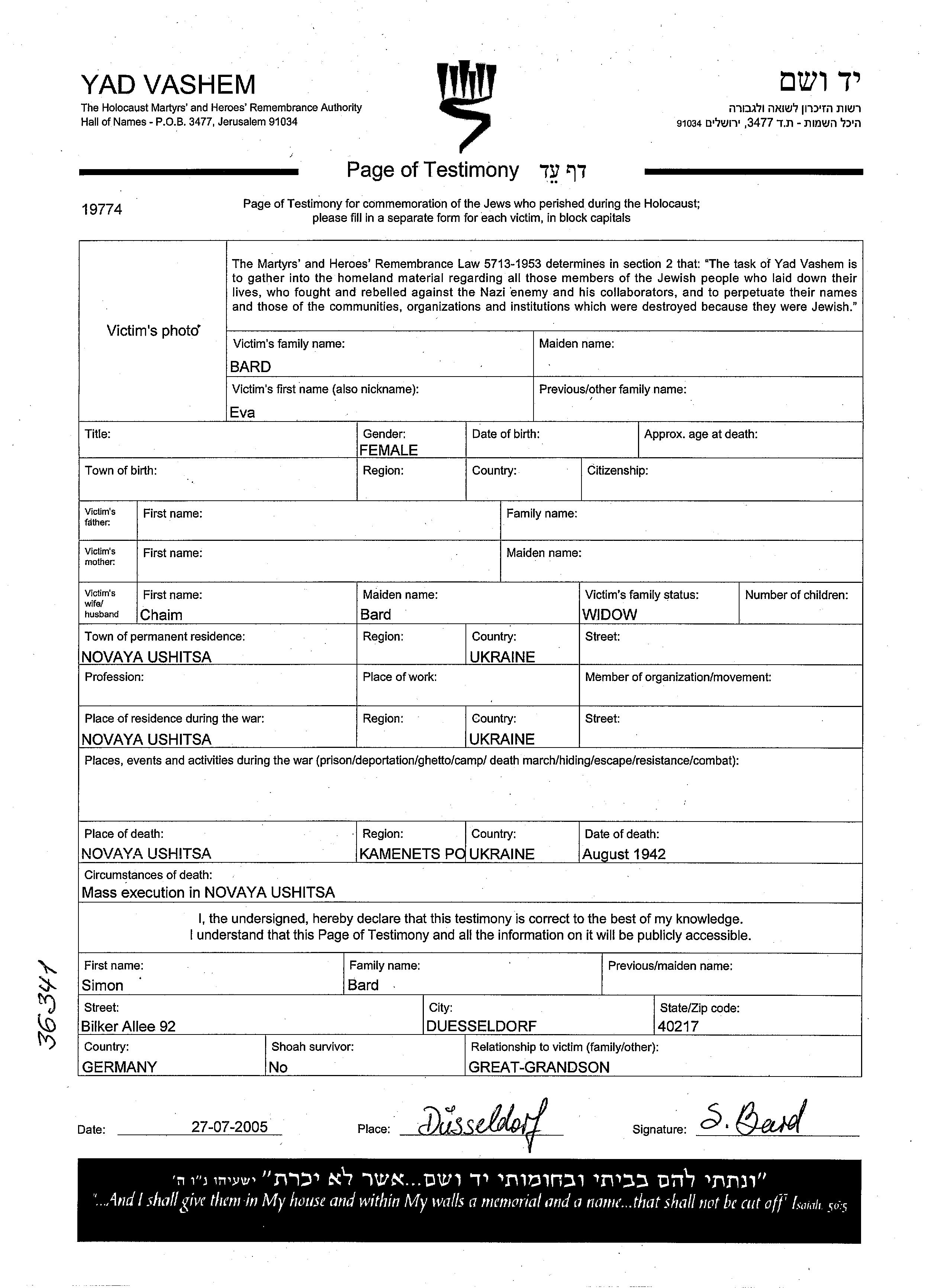 Эва Бард. Вдова. Место жительства до войны: Новая Ушица, Украина (СССР). Место во время войны: Новая Ушица, Украина (СССР).