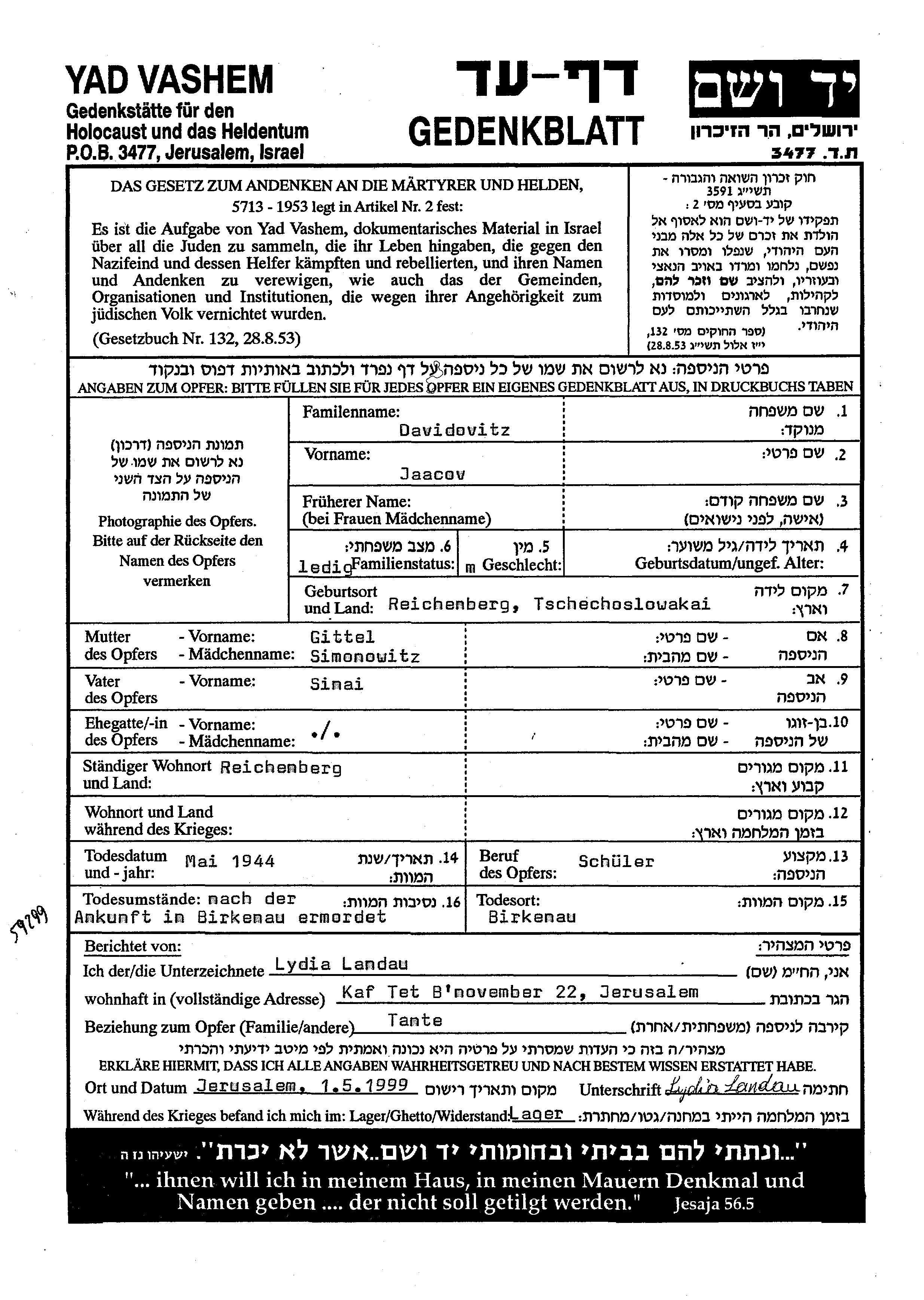 Яков Давидовиц, место рождения: Рейхенберг, Чехословакия. Отец: Синай, mать:Гиттель, девичья фамилия Симоновиц. Ученик / ученица. Ребенок. Место жительства до войны: Рейхенберг, Чехословакия.