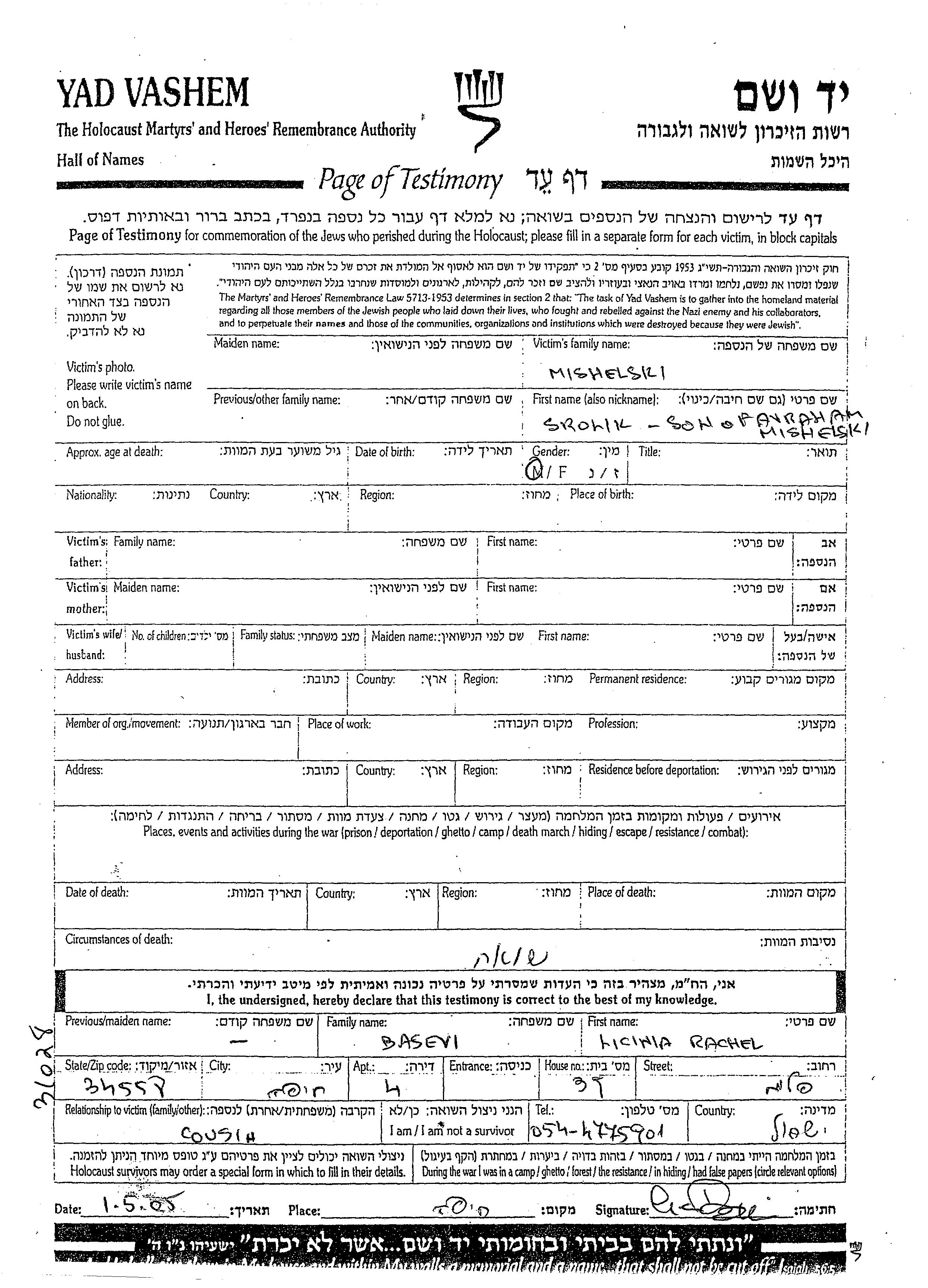 Яд Вашем - Листы свидетельских показаний Мемориального фонда