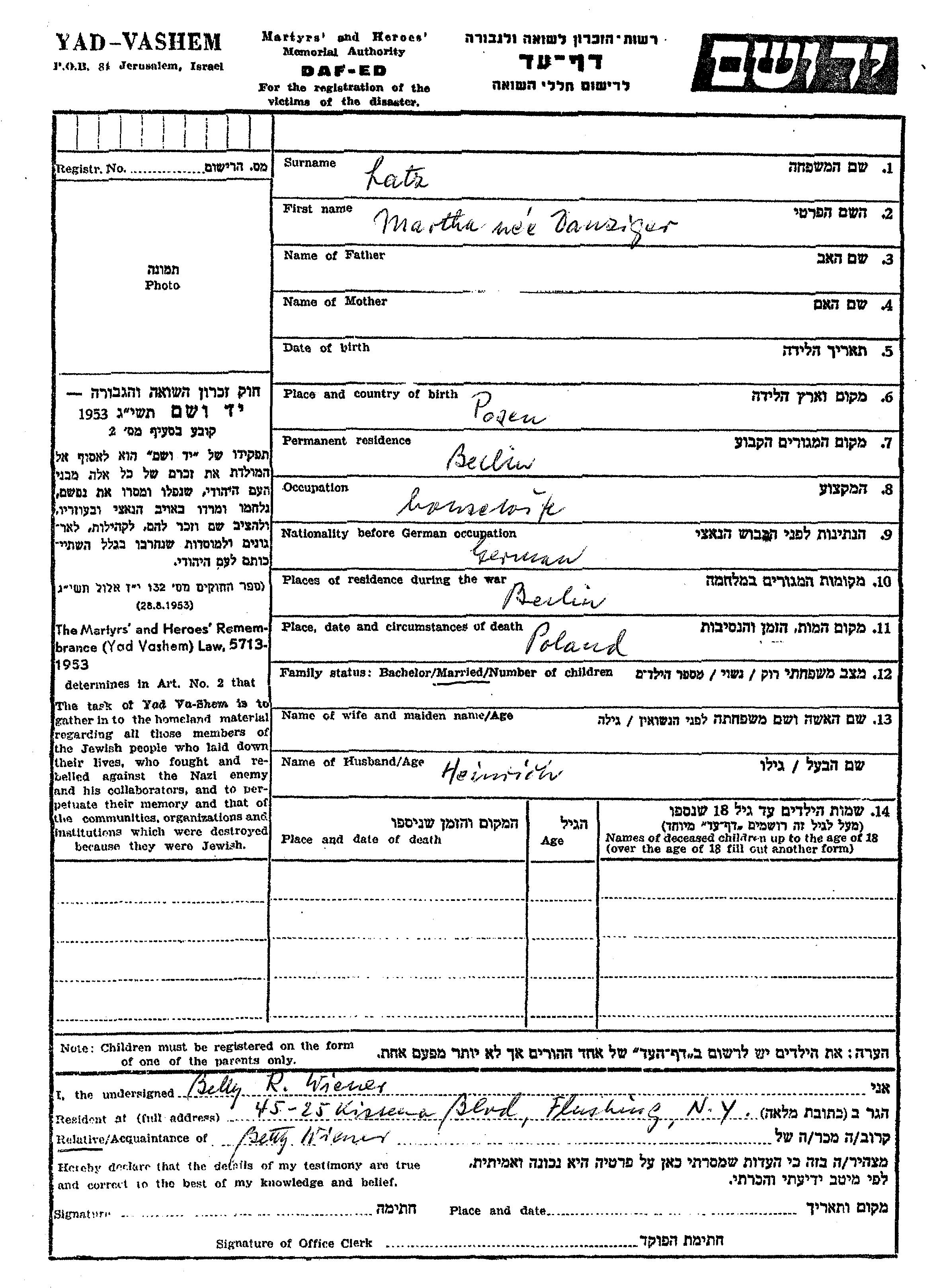 Марта Лац, девичья фамилия Данцигер, место рождения: Позен, Польша. Женат / замужем. Место жительства до войны: Берлин, Германия. Место во время войны: Берлин, Германия.