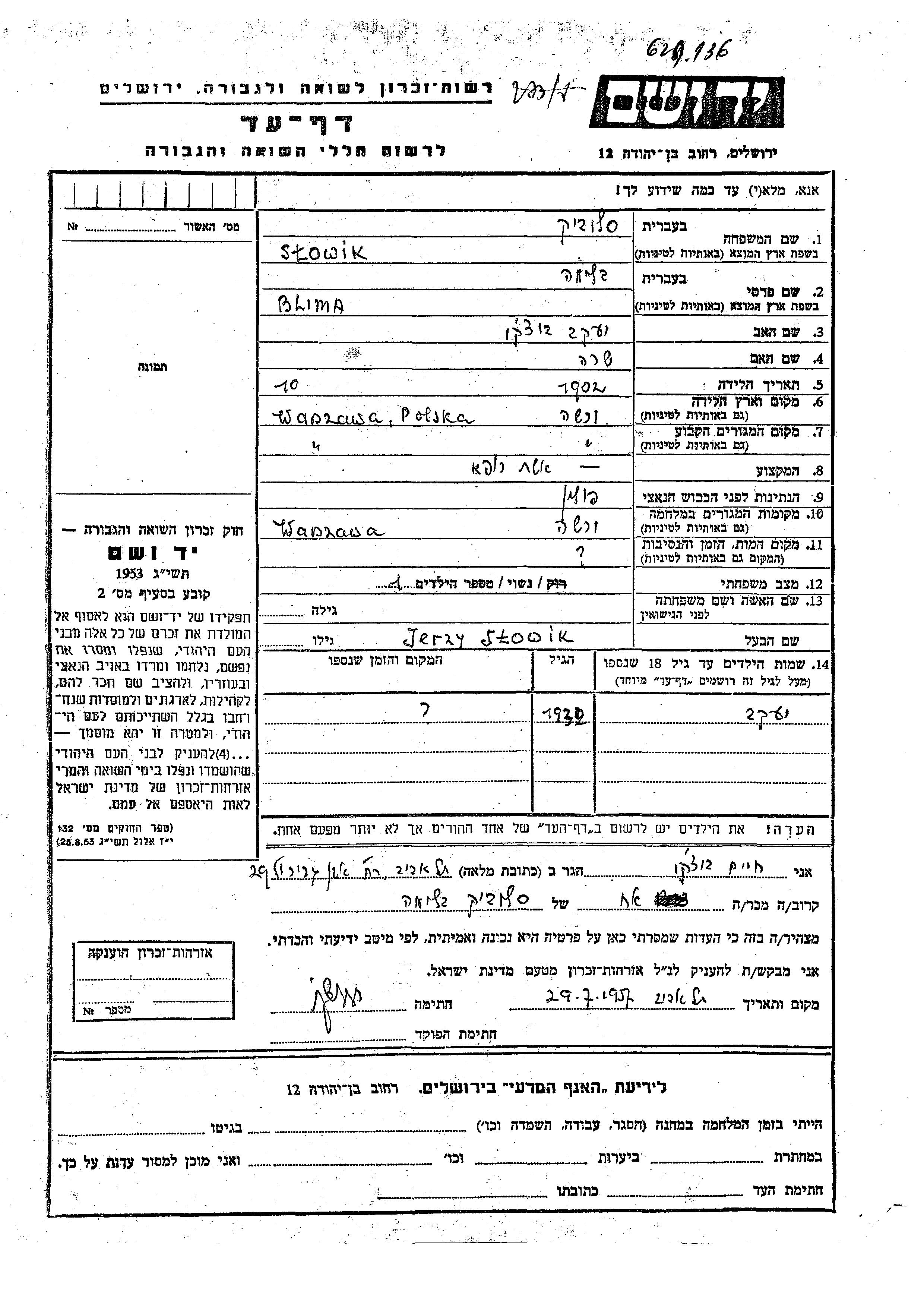 Блима Словик, место рождения: Варшава, Польша. Отец: Яков, mать:Сара. Женат / замужем. Место жительства до войны: Варшава, Польша. Место во время войны: Варшава, Польша.
