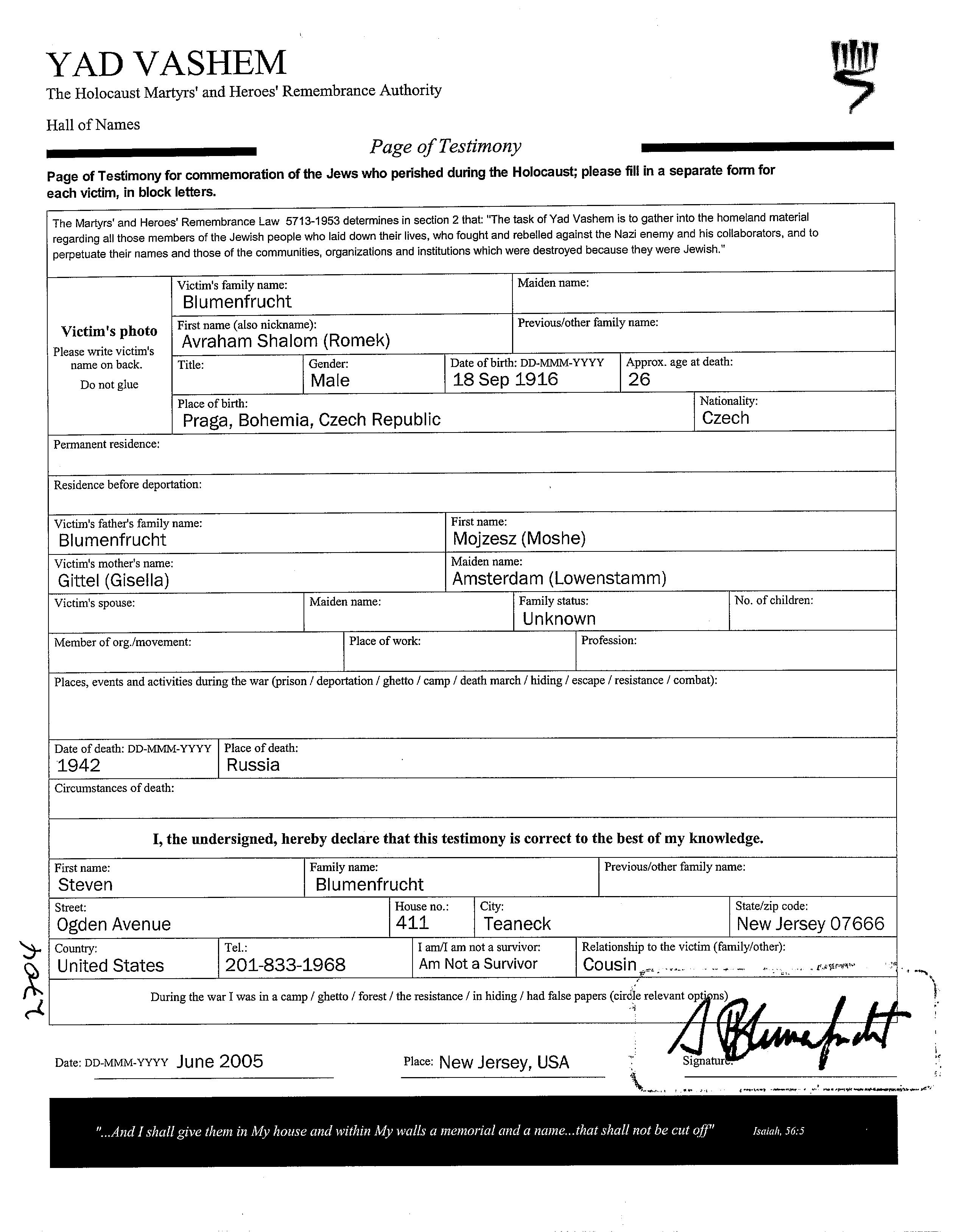 Шалом Авраам Ромек Блюменфрухт, место рождения: Прага, Чехословакия. Отец: Мойжеш, mать:Гиселла Гиттель, девичья фамилия Амстердам Лёвенштамм.