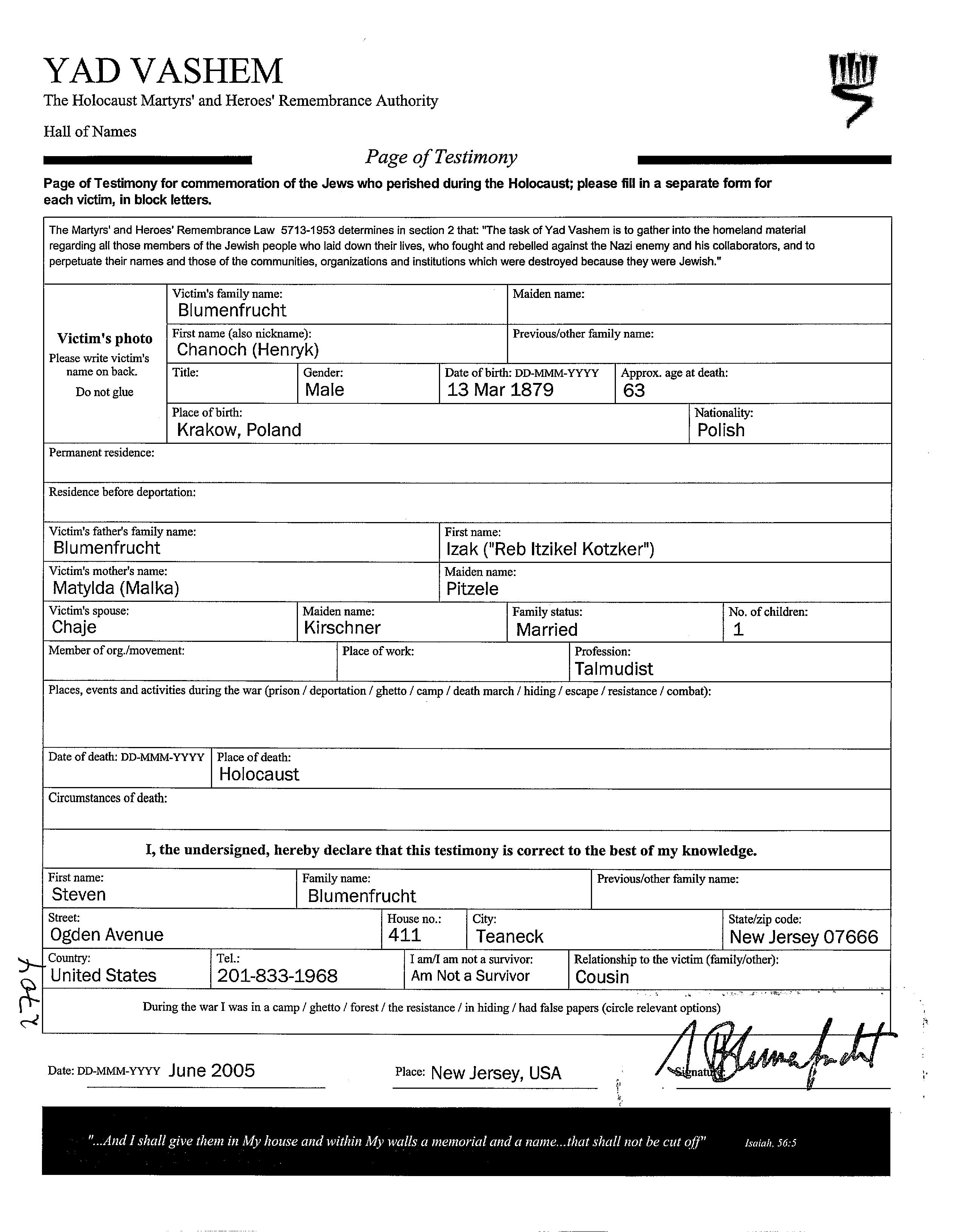 Ханох Хенрик Блюменфрухт, место рождения: Краков, Польша. Отец: Ицикель, mать:Матильда Малка, девичья фамилия Пицеле. Женат / замужем.