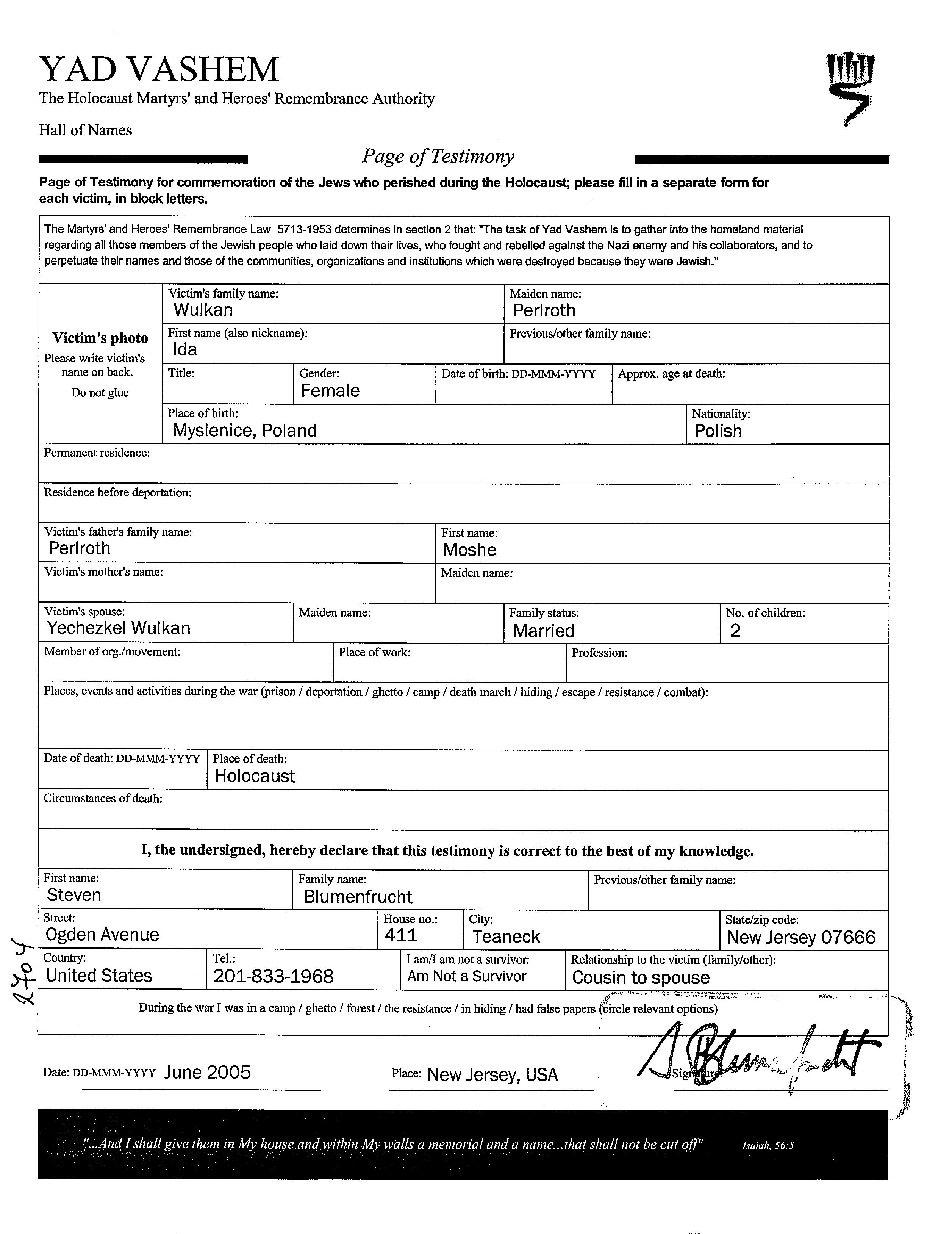Ида Вулькен, девичья фамилия Перльрот, место рождения: Мысленице, Польша. Отец: Моше. Женат / замужем.