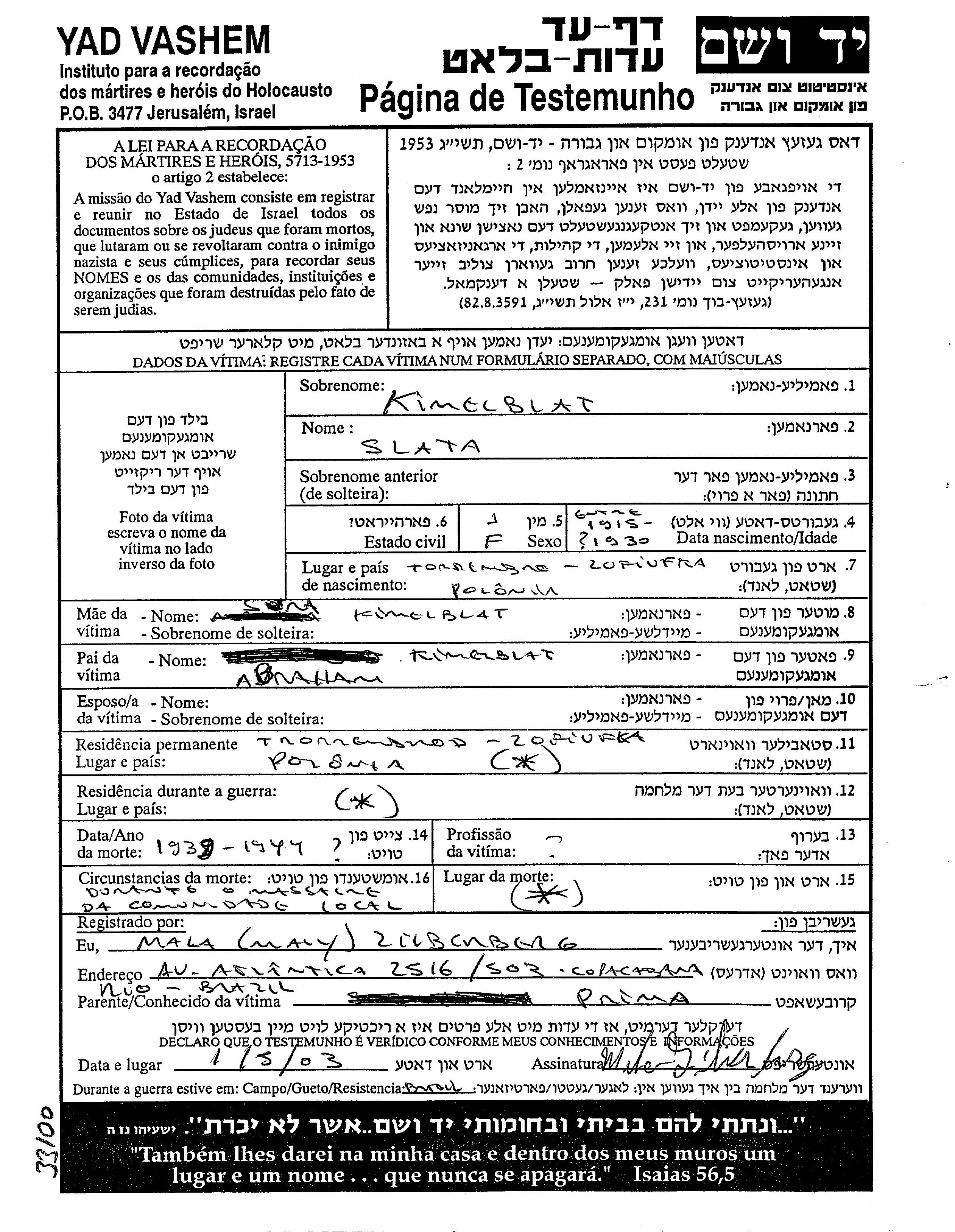Злата Кимельблат, место рождения: Зофьювка, Польша. Отец: Абраам, mать:Сура. Место жительства до войны: Зофьювка, Польша.