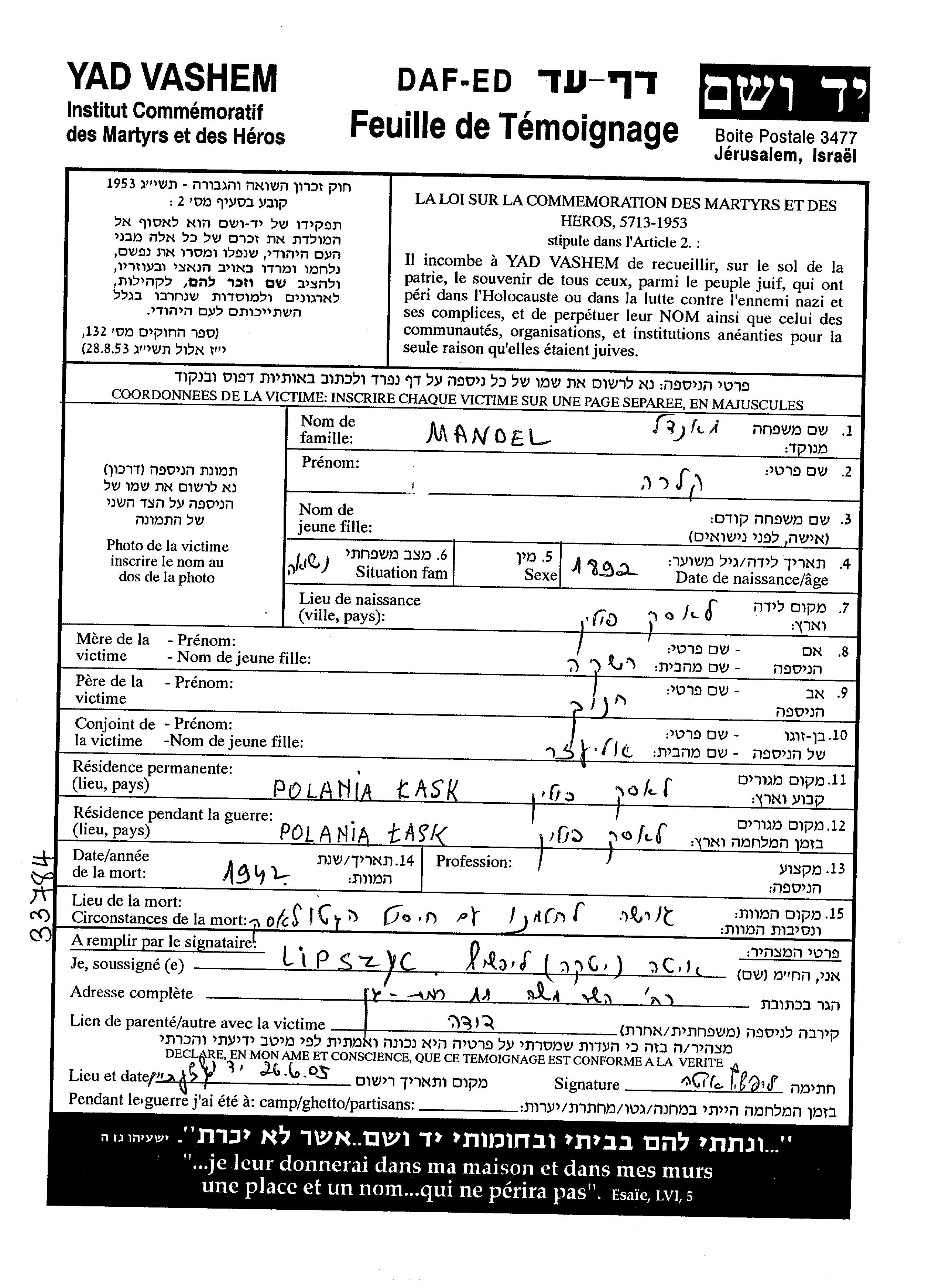 Клара Мандель, место рождения: Ласк, Польша. Отец: Ханох, mать:Рашка. Женат / замужем. Место жительства до войны: Ласк, Польша. Место во время войны: Ласк, Польша.