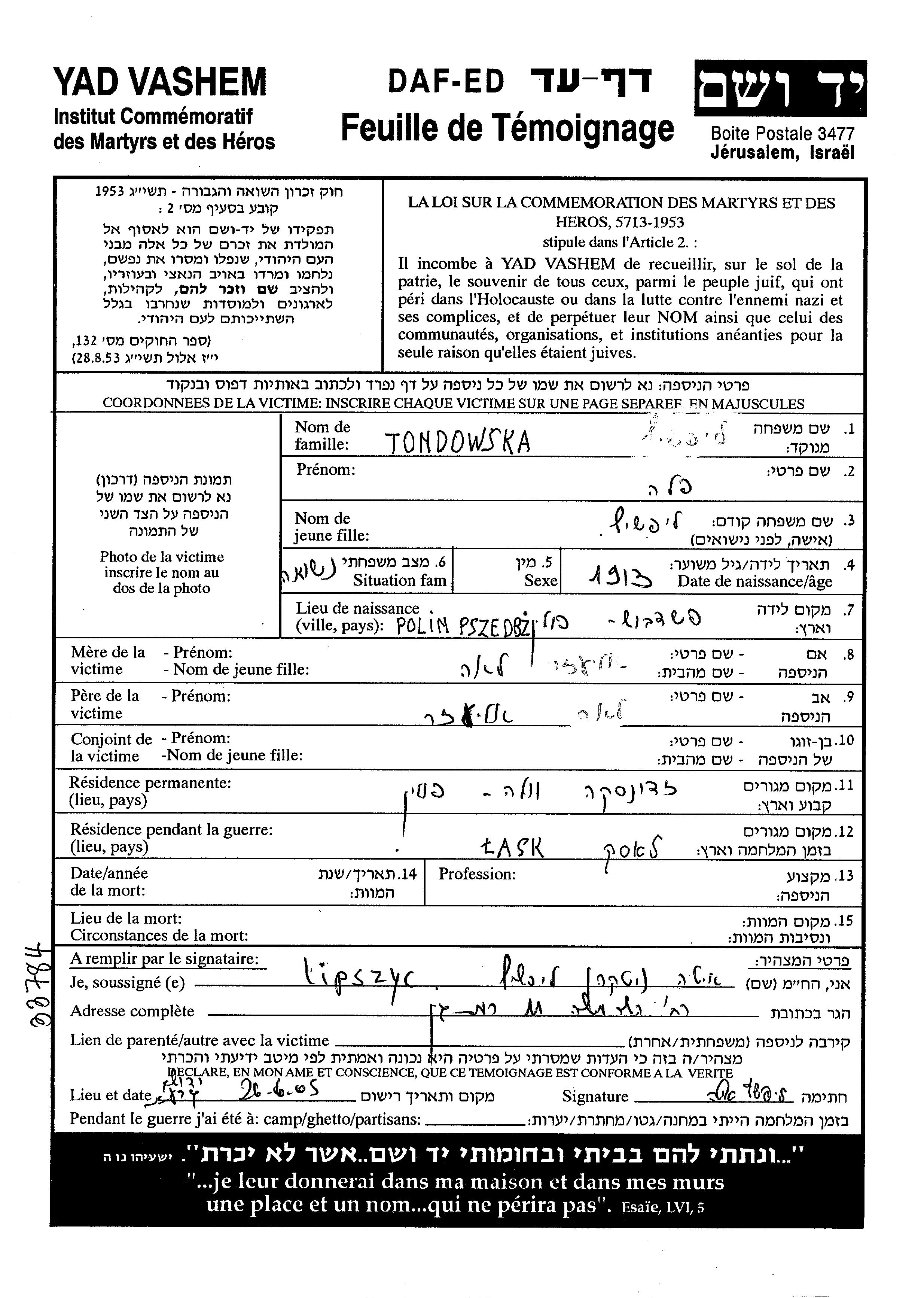 Фела Тондовска, девичья фамилия Липшиц, место рождения: Пшедбуж, Польша. Отец: Элазар, mать:Лея. Женат / замужем. Место жительства до войны: Здуньска-Воля, Польша. Место во время войны: Ласк, Польша.
