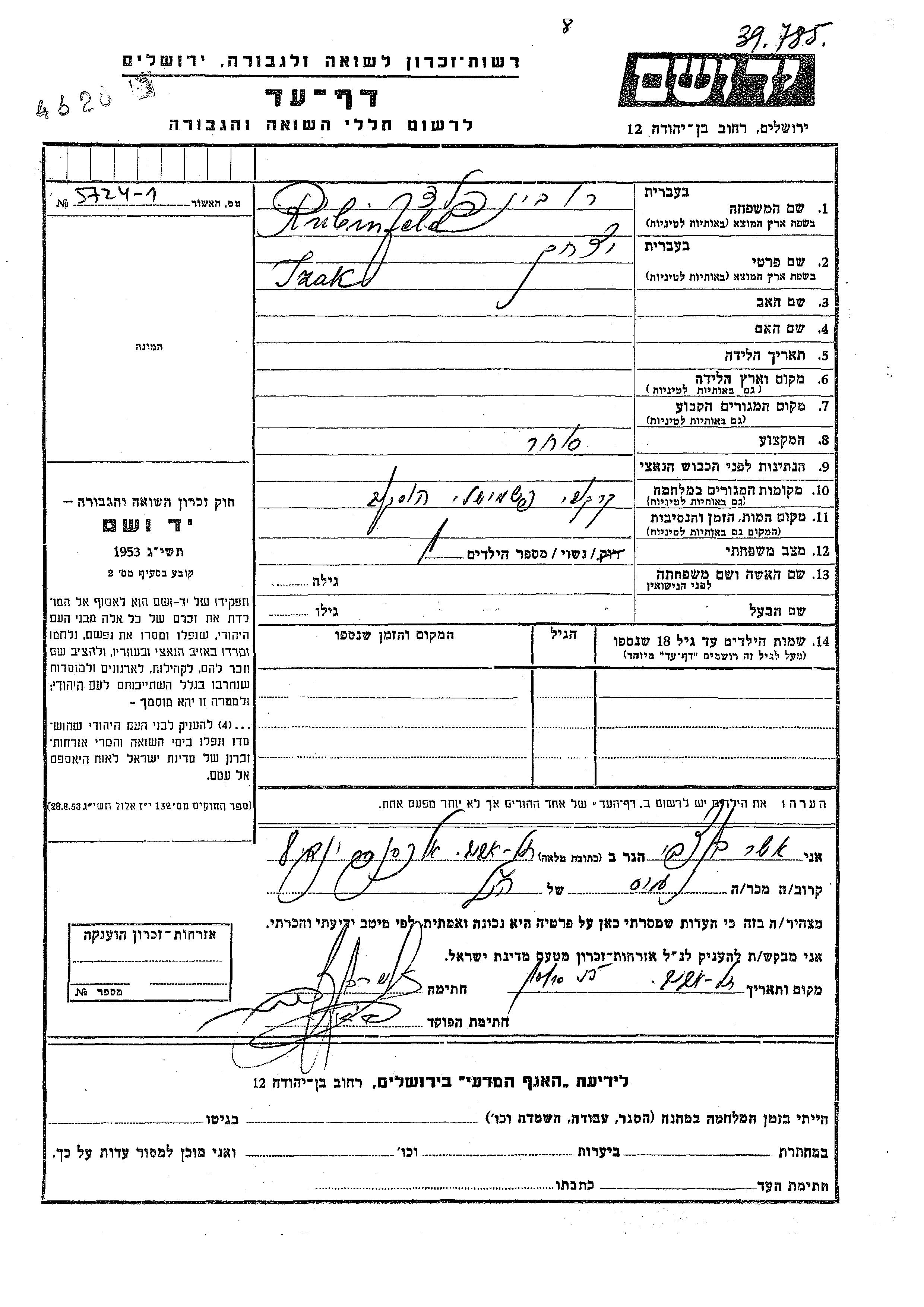 Изак Рубинфельд. Торговец / торговка. Женат / замужем. Место во время войны: Гусаков, Польша.
